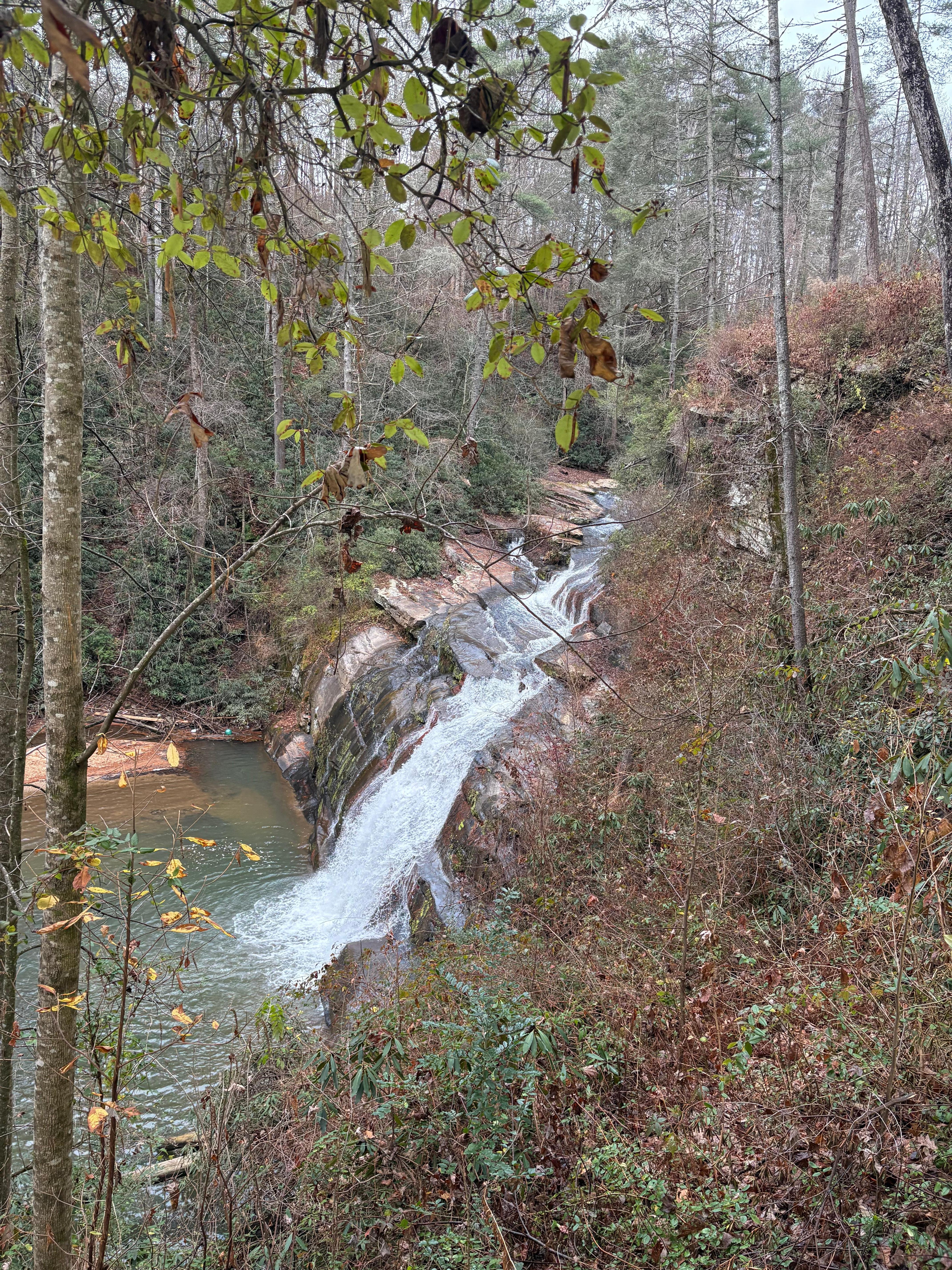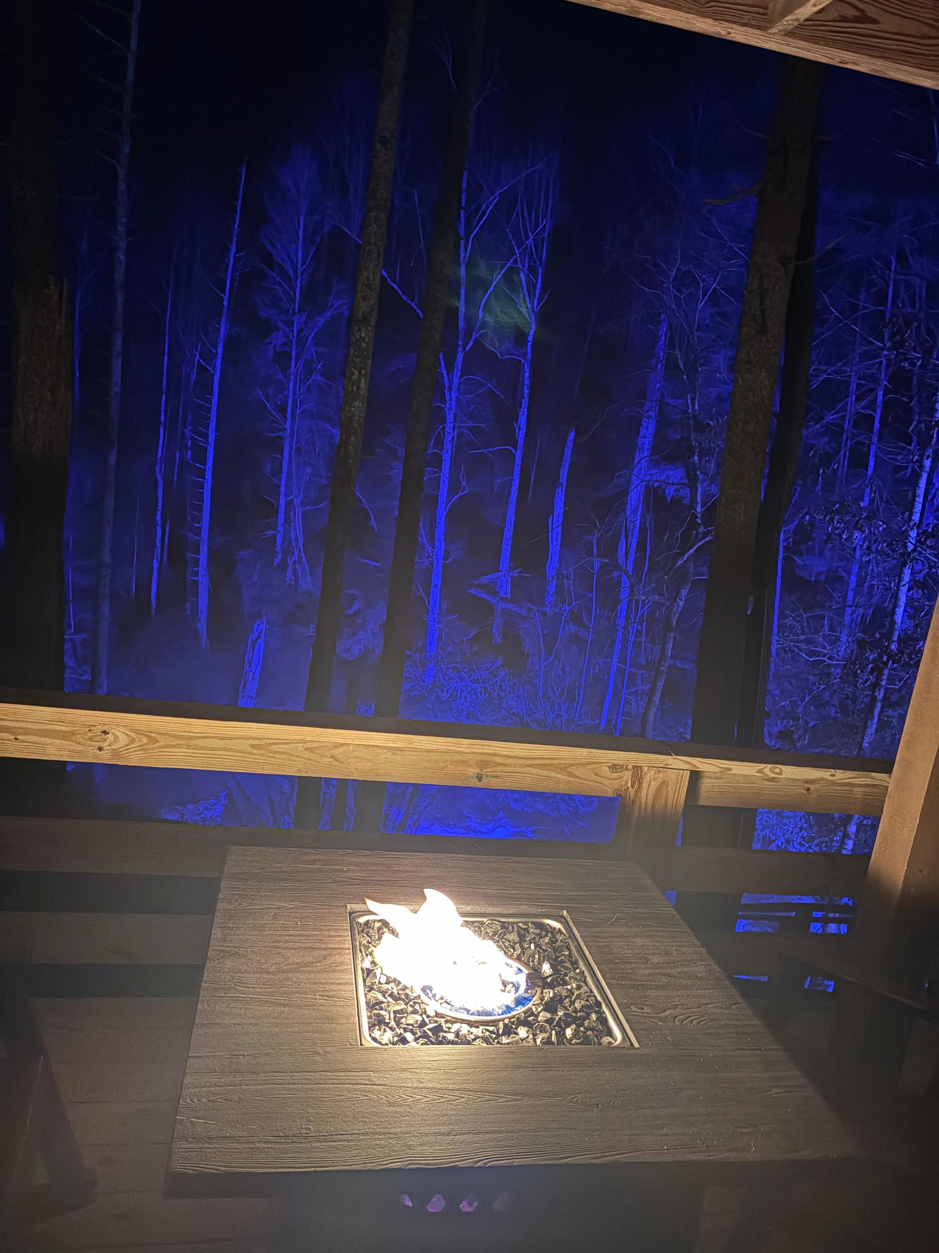 Our waterfall retreat offers convenient day and night access to the large recreation deck (propane gas fire pit, tables with umbrellas, chairs, rocking chairs, and even a cornhole game). From this deck, step onto a wooded trail winding down to the riverside and waterfall. Lay directly in the falls, relax in the water, or simply enjoy the sounds and scenery!