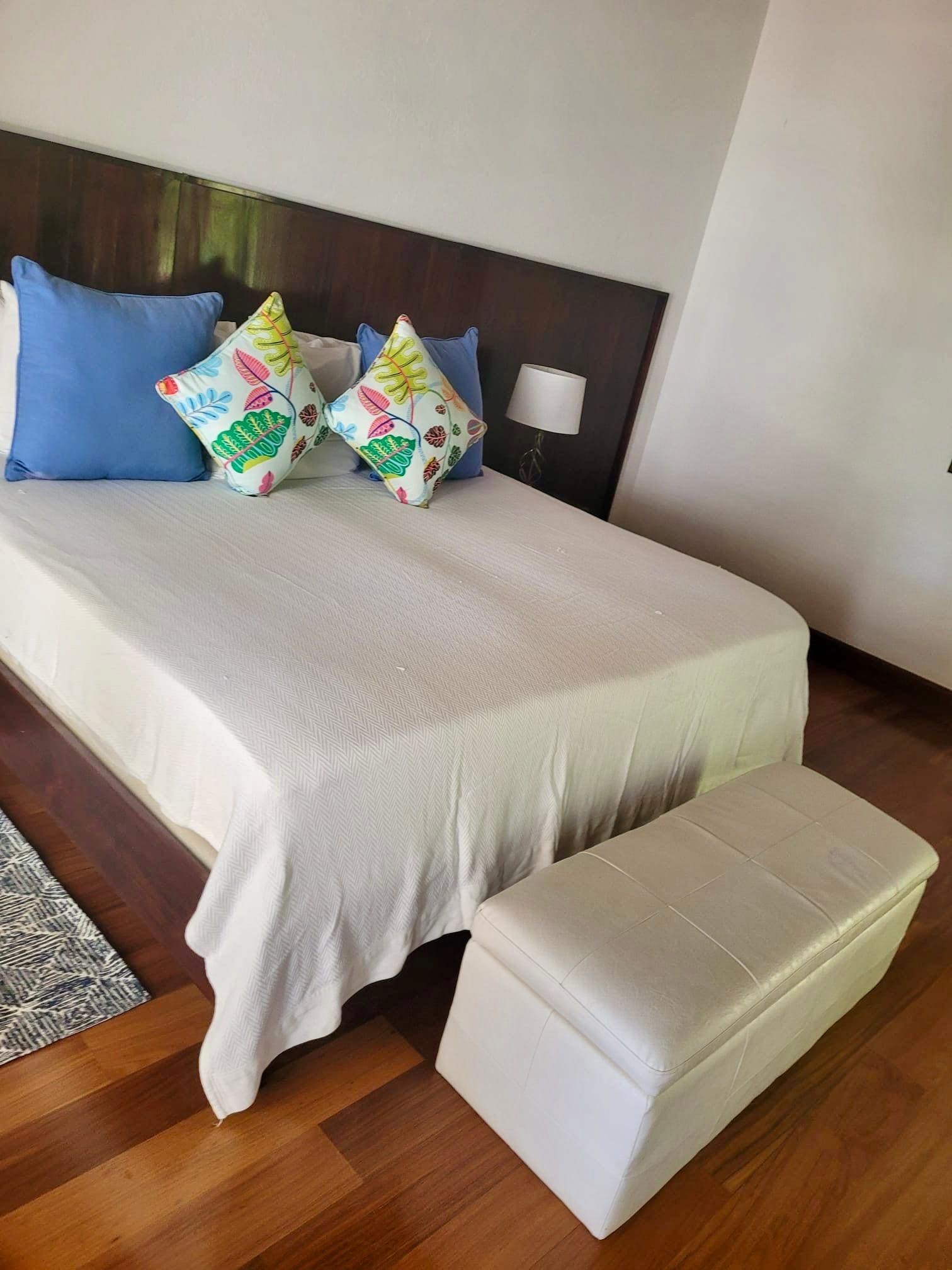 Three master bedrooms are accessible via the terrace or an interior hallway. Two of these measure eighteen feet squared, and have en-suite bathrooms with walk in showers and walk-in closets. The third master bedroom measures twenty feet squared and has an en-suite bathroom with walk-in shower, an outdoor shower, and jacuzzi bathtub. There is also a two bedroom family suite which share an en-suite bathroom with walk-in shower and bathtub. The parents (or nanny) room, considered the forth master, has a secure private outdoor garden. All bedrooms have been floored in beautiful teak wood, are comfortably air conditioned and have televisions with cable access.
