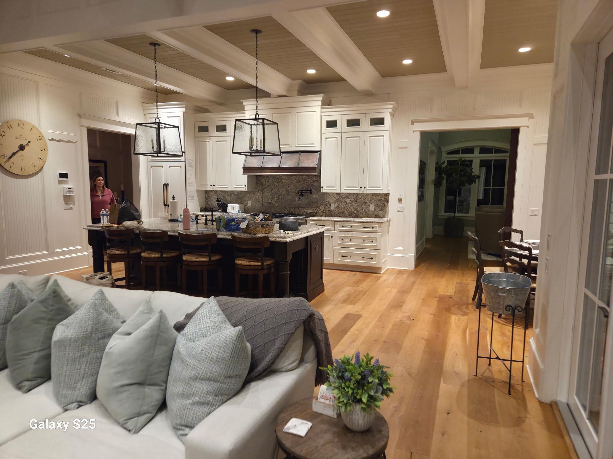 The chef's kitchen boasts high-end appliances, including a gas range and pot filler, perfect for cooking family meals or entertaining. Adjacent to the kitchen, the dining area features a large table for group dinners, while the kitchen island provides additional seating.