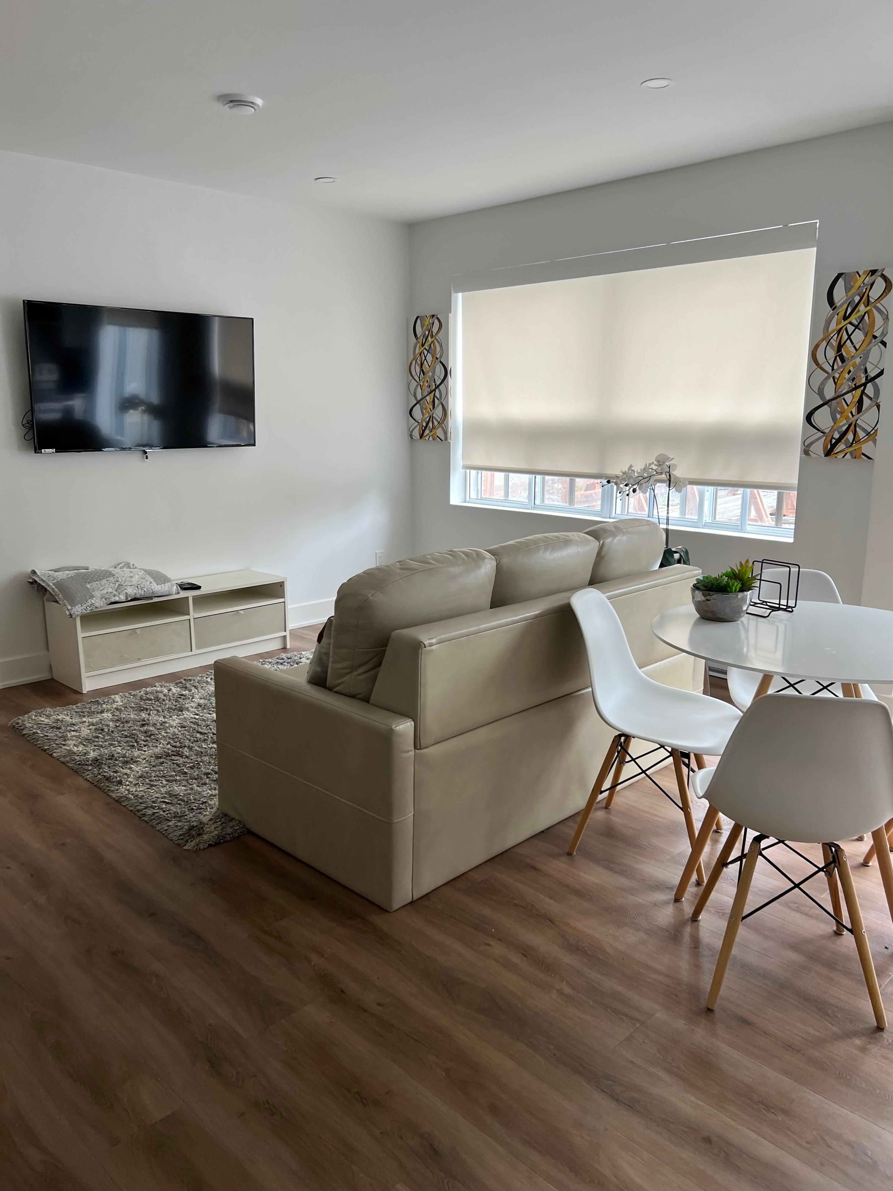 Welcome to Zino Suites. Discover the beauty of Pointe-Claire from this lovely 1-bedroom apartment. This serene space offers a living room with a cozy sofa bed, perfect for unwinding after a day of exploring. Guests can enjoy amenities like AC, WiFi, Off Street Parking, Washer & Dryer and a private patio space with umbrella, table & chairs, making their stay comfortable and convenient. You're sure to make fantastic memories with a stay at our place. It's about 3mins drive to a waterfront in Pointe-Claire village with restaurants within walking distance. There's also a bus stop next to the building.