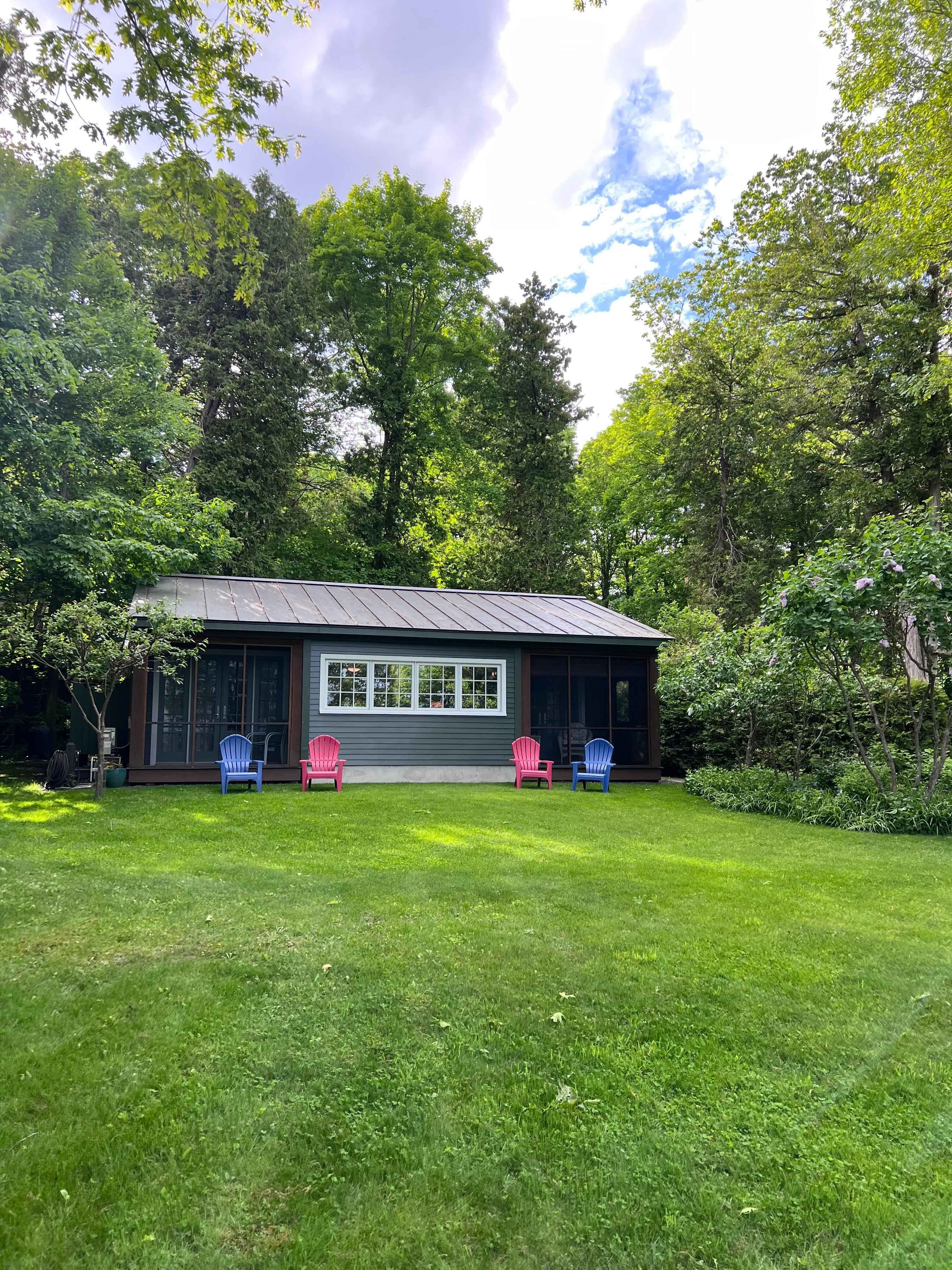 floor plan, 2 bedrooms with a queen in one and 2 twins in the other. Altogether, the cottage sleeps four comfortably. Each bedroom has a ceiling fan and french doors that open onto a screened porch facing the lake. Plenty of windows for those lake breezes, fully equipped kitchen, spacious bathroom with tile shower, washer/dryer, municipal water. Lovely, private outside shower, wifi, Smart TV, outdoor grill and picnic table overlooking the spacious lawn, gardens and children's play area. Our cottage is equipped with a heat pump which provides both heat and air conditioning. We also have a level 2 EV charger, available upon request.