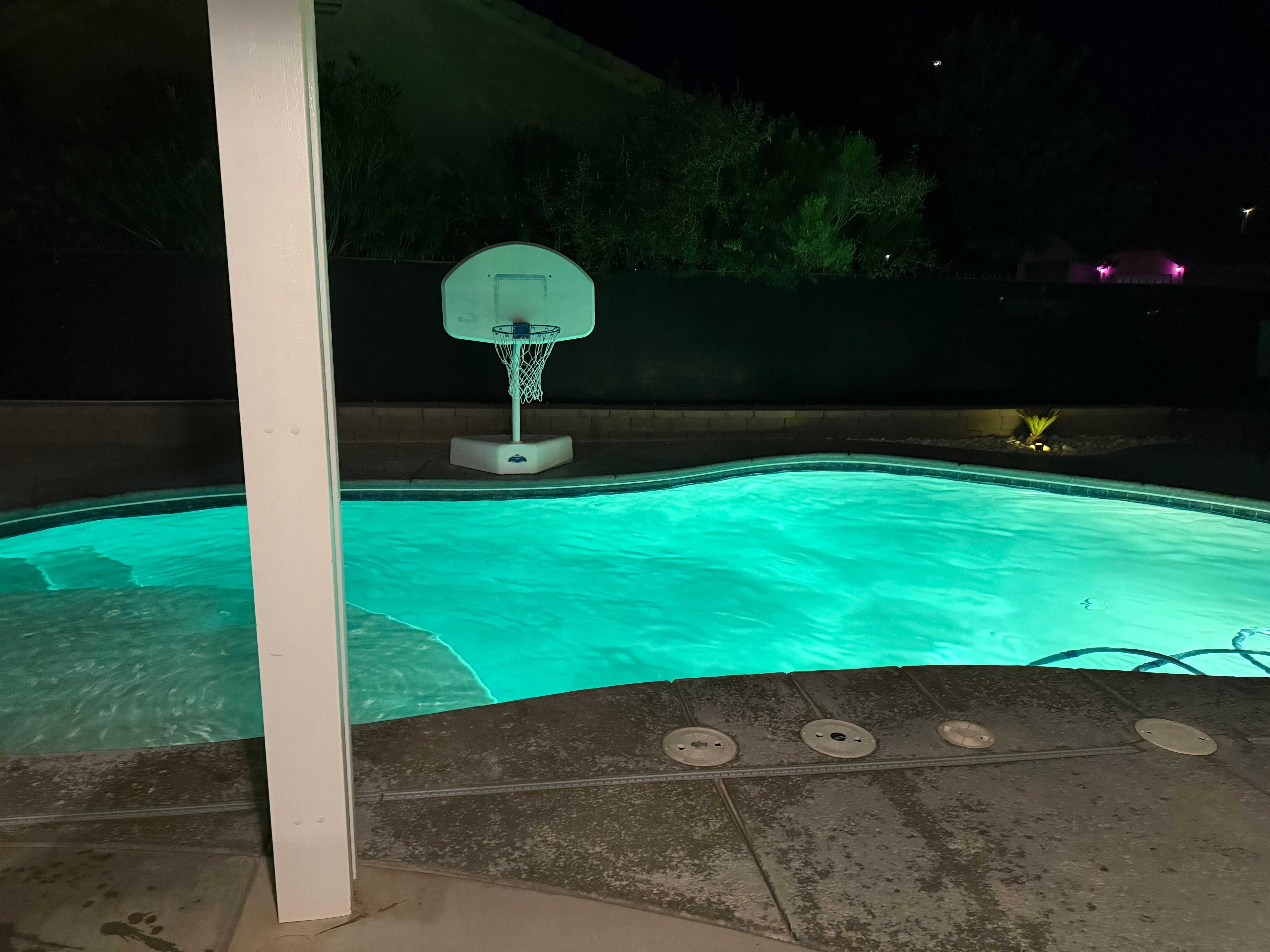 This NO SMOKING/NO PETS ($500 fine), beautifully maintained property sits on a corner lot in a quiet, friendly, and peaceful neighborhood. In the morning, sip your coffee on the front patio or share breakfast together with the entire group at our large outdoor table. A fun putting green is ready for the competitive types. Those that want to chill a bit can find their way to soak in the hot tub, visit around the fire pit while enjoying the sunset, or float in the heated, clear blue pool. With a basketball hoop, floating toys, and ample deck seating, our pool is ready for fun. A propane grill is offered for cookouts and there is plenty of shade to retreat. Pockets of privacy create numerous options for outdoor entertainment.