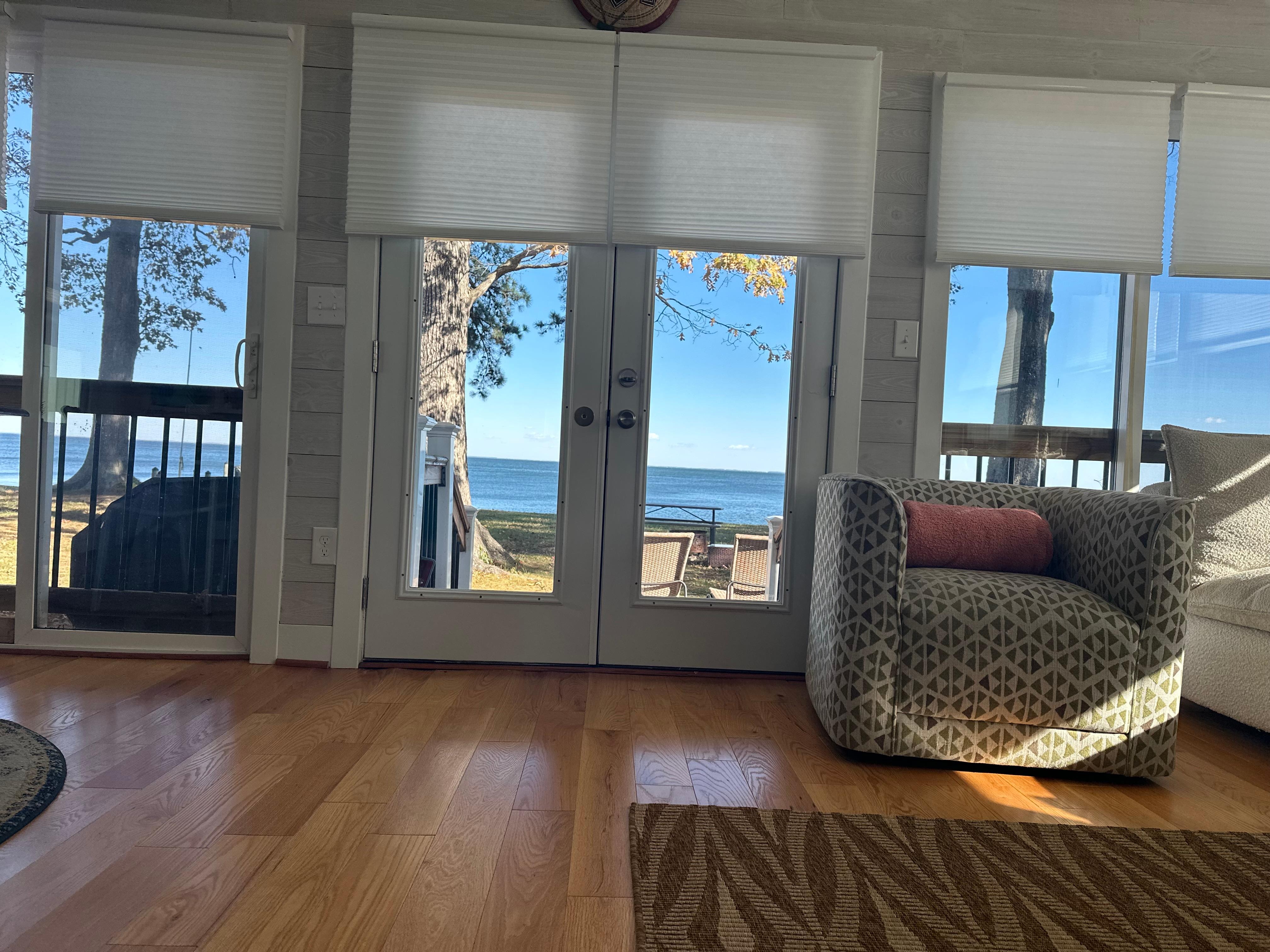 **Stunning Views:** Enjoy breathtaking sunrises and sunsets over the Chesapeake Bay from living room and dining room with full floor to ceiling windows/doors and a large picture window, complete with comfortable seating for morning coffee or evening cocktails.