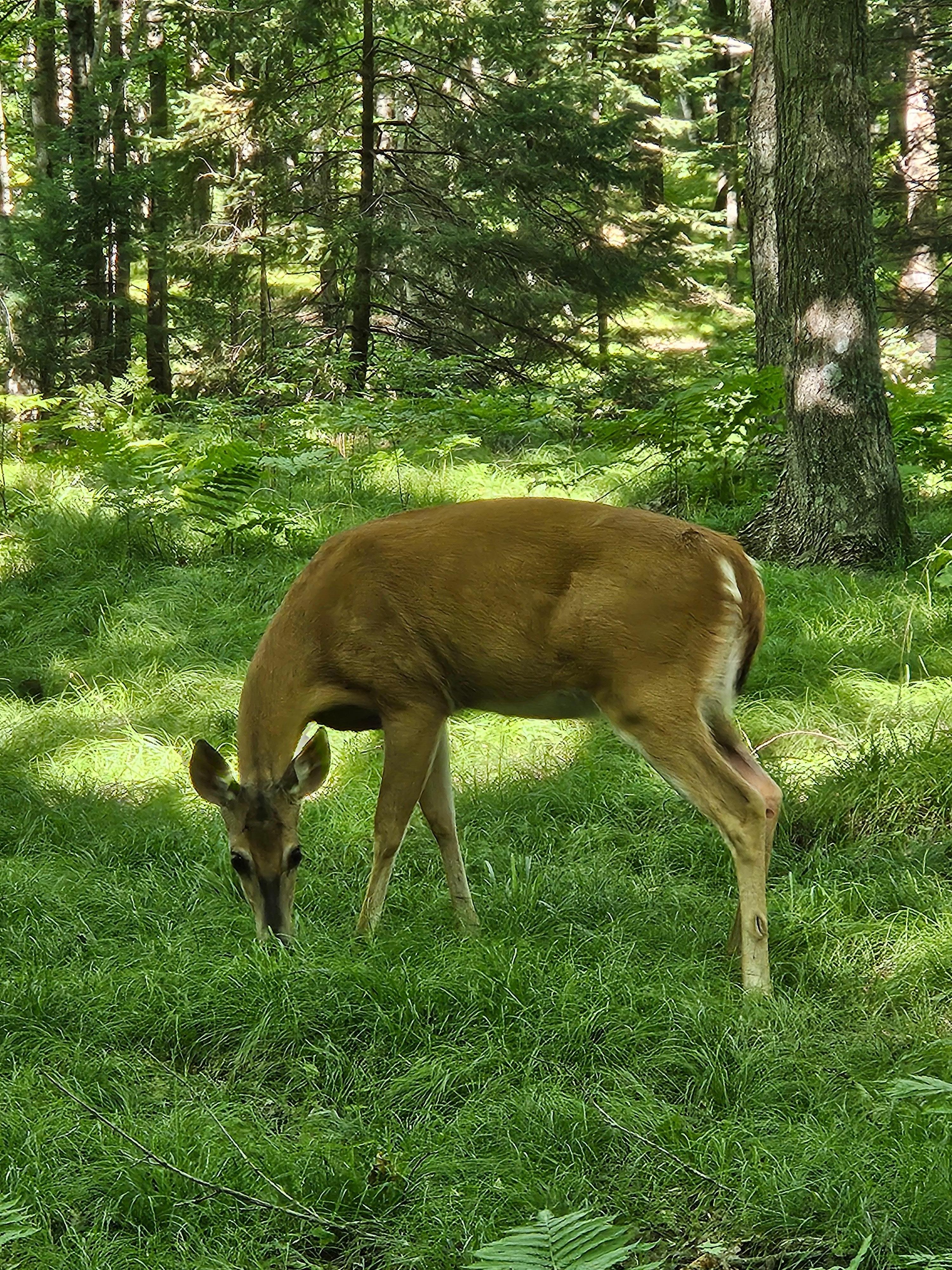 This 2-bedroom retreat features 2 bedrooms, a full bathroom, and a cozy living room with a sofa bed. The lake side faces south and there's a "morning coffee deck" for a peaceful morning. The full kitchen, a living room with a solid stone fireplace, a cozy reading corner and dining area for 6, all share the open area. The woods-side of the cabin has a large screened porch with rocking chairs, a table/chairs and games with a spectacular view of the woods. You'll hopefully see the deer, red fox and black bear (very rare). Also, watch for bald eagles, hummingbirds, pileated woodpeckers and red headed woodpeckers and falling stars.