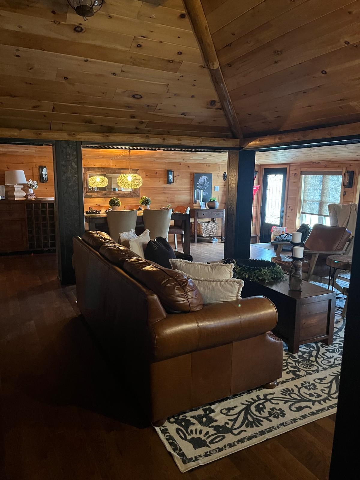 Cabin #1, the original cabin completed renovated in 2011 , features three bedrooms with double beds, a fully open concept living area, ample space for gathering.