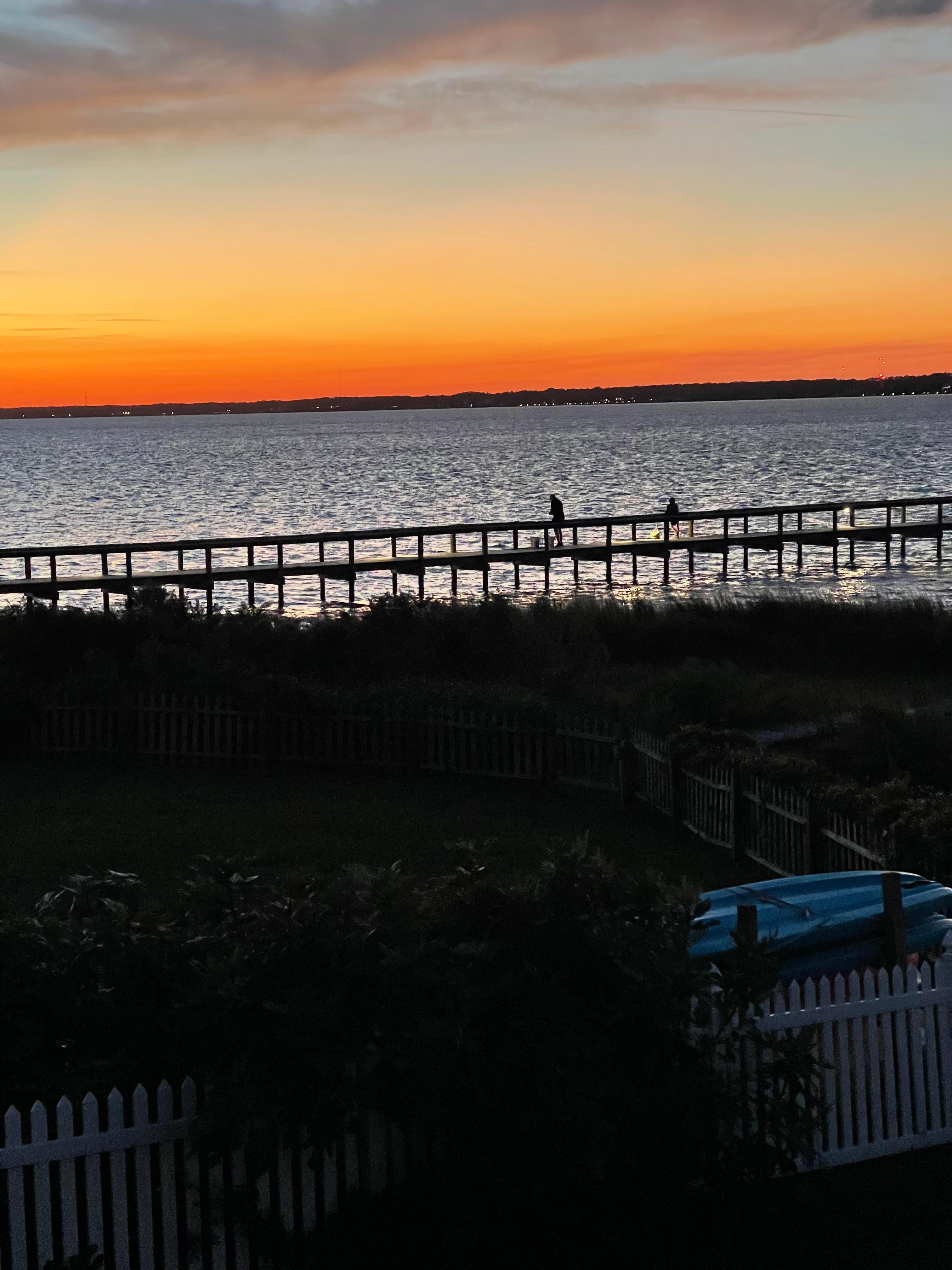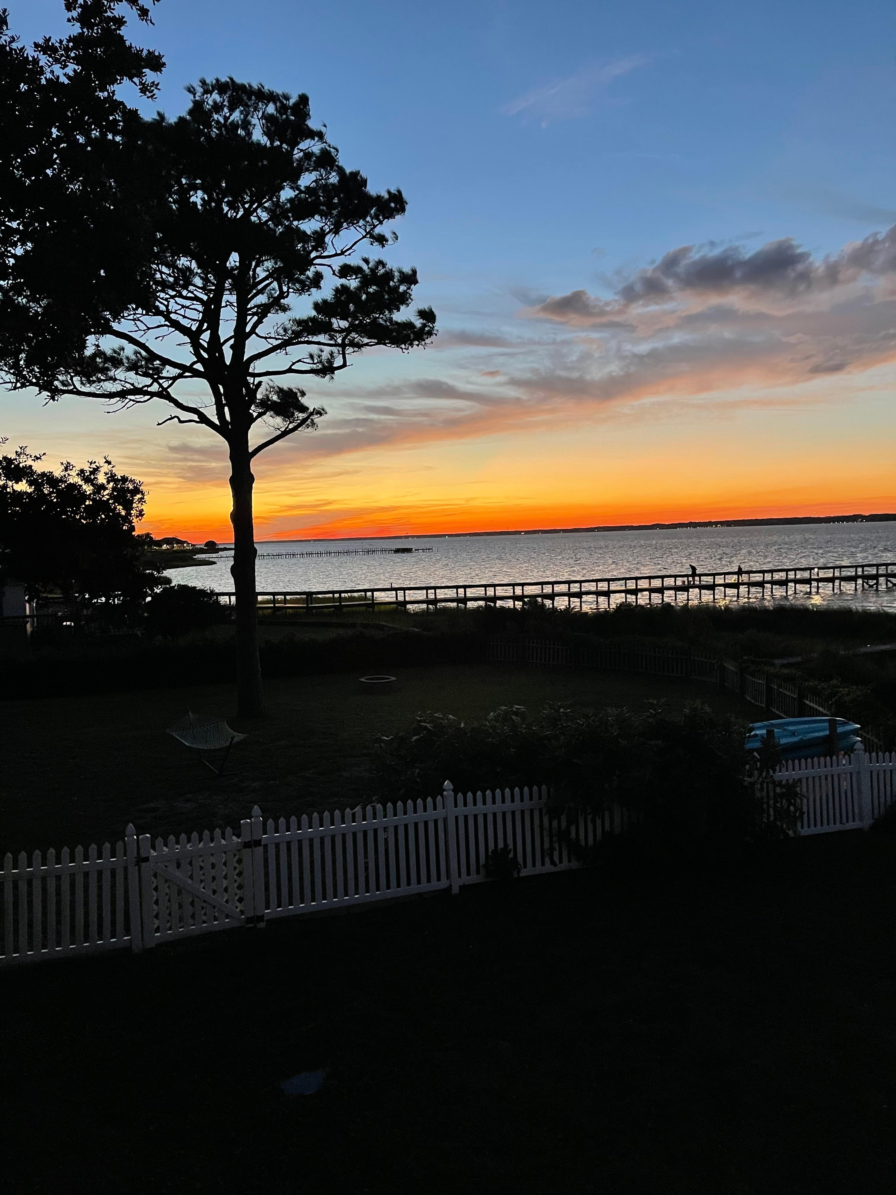 The backyard is a sound front oasis, offering spectacular sunset views. There is seating, a table, and sunbathing chairs available for guests to use. This area is perfect to cool down in the North Carolina sun, unwind while reading a book or enjoy an evening cocktail by the water. There is a propane grill, outdoor shower and games such as cornhole and giant jenga available for guests in the backyard.
