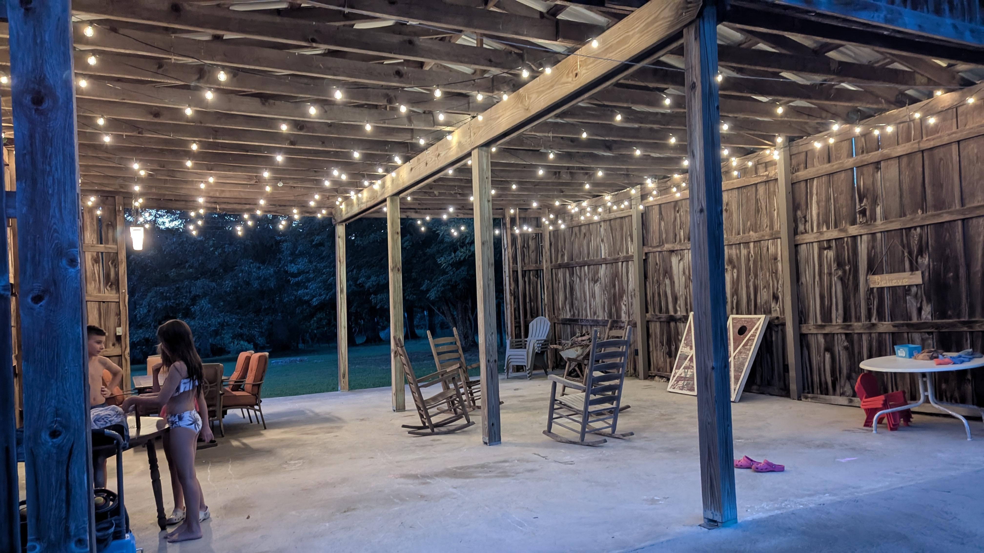 The kitchen offers everything needed for your stay. With two separate round tables and bar stools, you can all enjoy a sit-down meal in the house - or a picnic style meal in the pole barn which is lighted with strings of clear lights.