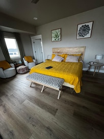 Experience breathtaking panoramic views of the iconic Snake River Canyon from this luxurious guest suite. Designed for ultimate comfort, the space features a King bed and a full bathroom complete with a relaxing tub and shower. Step outside to the open-air patio, where cozy seating surrounds a fire pit, creating the perfect ambiance for unwinding under the stars. The oversized glass door floods the suite with natural light and provides uninterrupted views, setting the stage for a memorable stay.