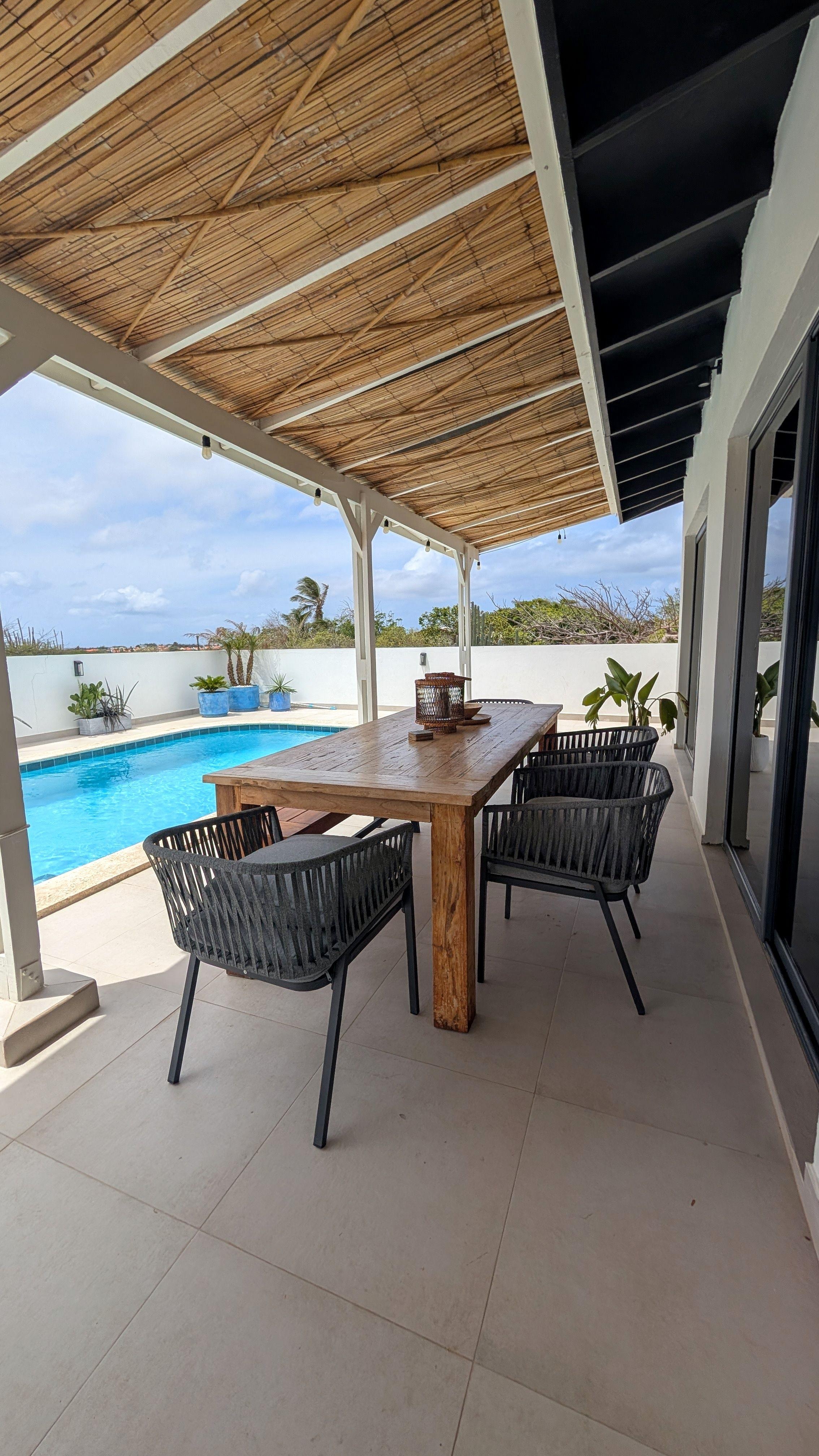 This brand-new villa is a true oasis for those seeking a tranquil getaway and privacy. With comfy king-size beds, 100% cotton sheets, a private pool, a gas grill, a fully equipped kitchen, beach chairs, beach towels, and a cooler, it is the perfect retreat to relax and rejuvenate while exploring what Aruba offers. This beautiful villa has been completely renovated and is designed for 6 people, but there is enough space in bedroom 2 to add a two-person air mattress upon request. The villa offers a cozy, warm, and atmospheric interior that immediately makes you feel at home. You will enjoy the green views and the best sunsets!