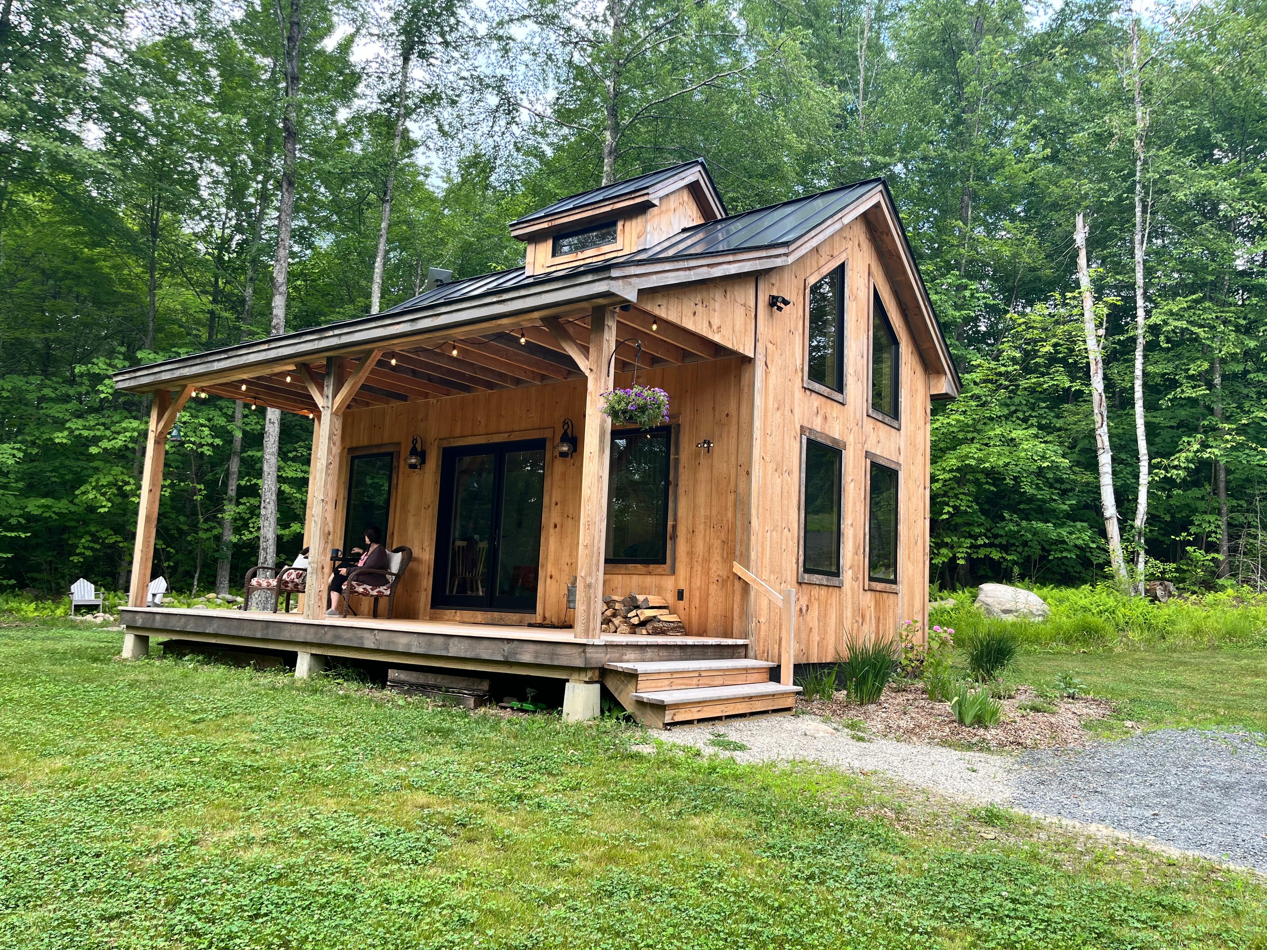 The house, modeled after a traditional Vermont sugar house, has cathedral ceilings, hardwood floors and cabinets, granite countertops, and a tiled shower.