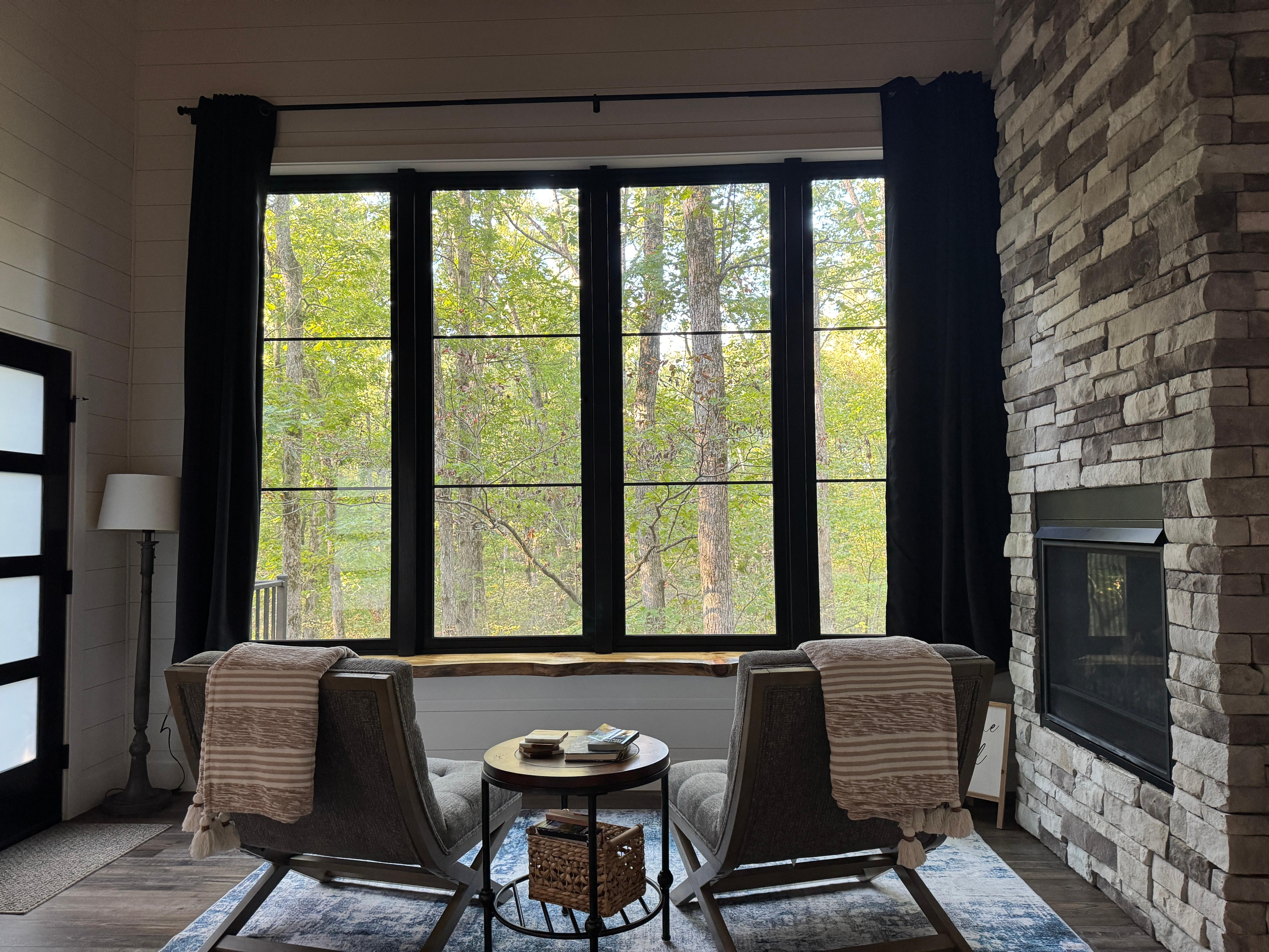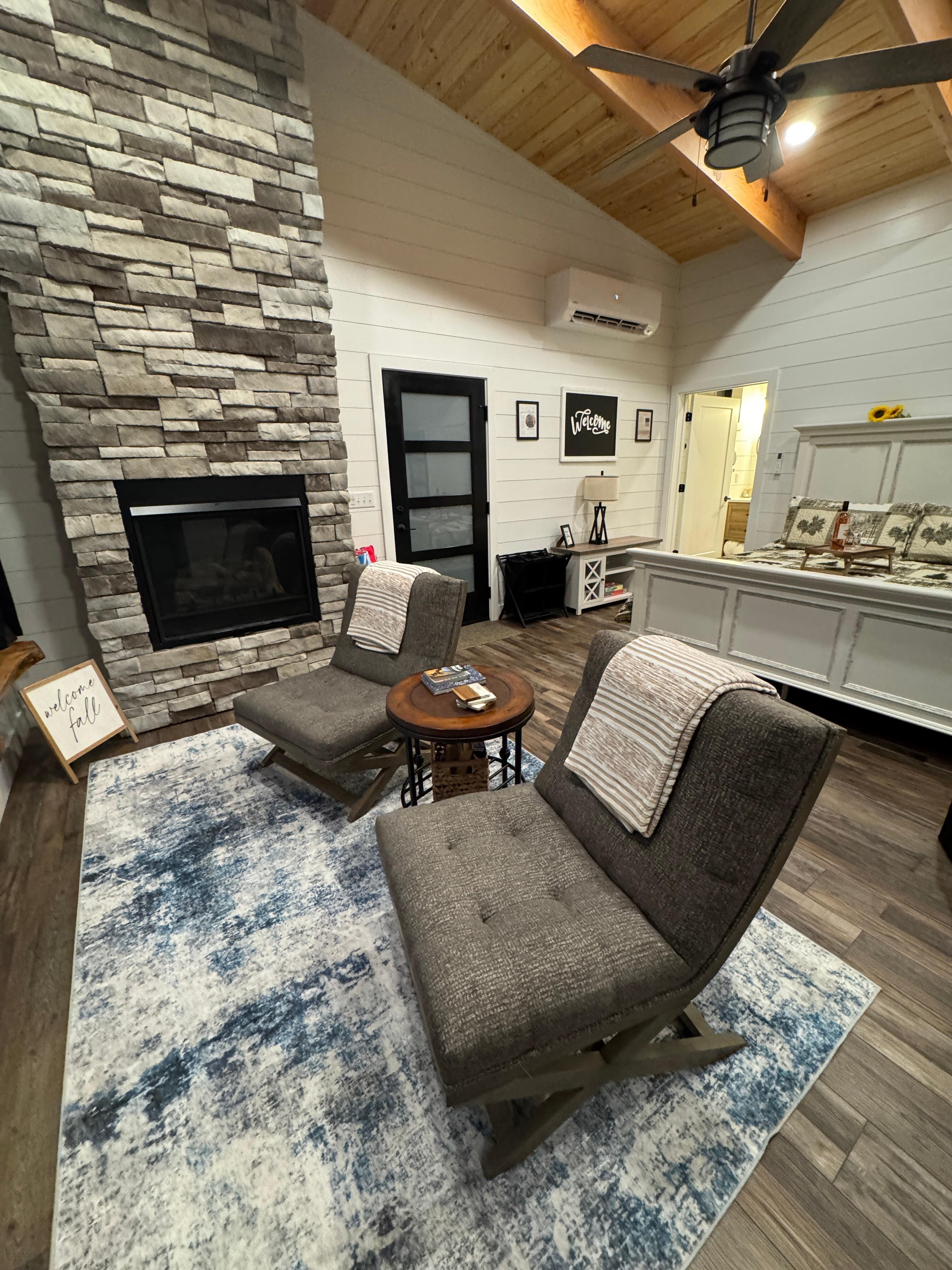 Upon entry into our treehouse, you will enjoy natural sunlight that peaks through the large picture window. The kitchen, living and bedroom areas are all open spaces that flow together seamlessly with plenty of places to sit and relax. The kitchen is stocked for your cooking needs in addition to a Keurig for your morning coffee, tea or hot chocolate. Enjoy puzzles, games or books for relaxing days. On cold evenings, grab a blanket and snuggle in front of a floor-to-ceiling stone fireplace. The laundry room is available for your use.