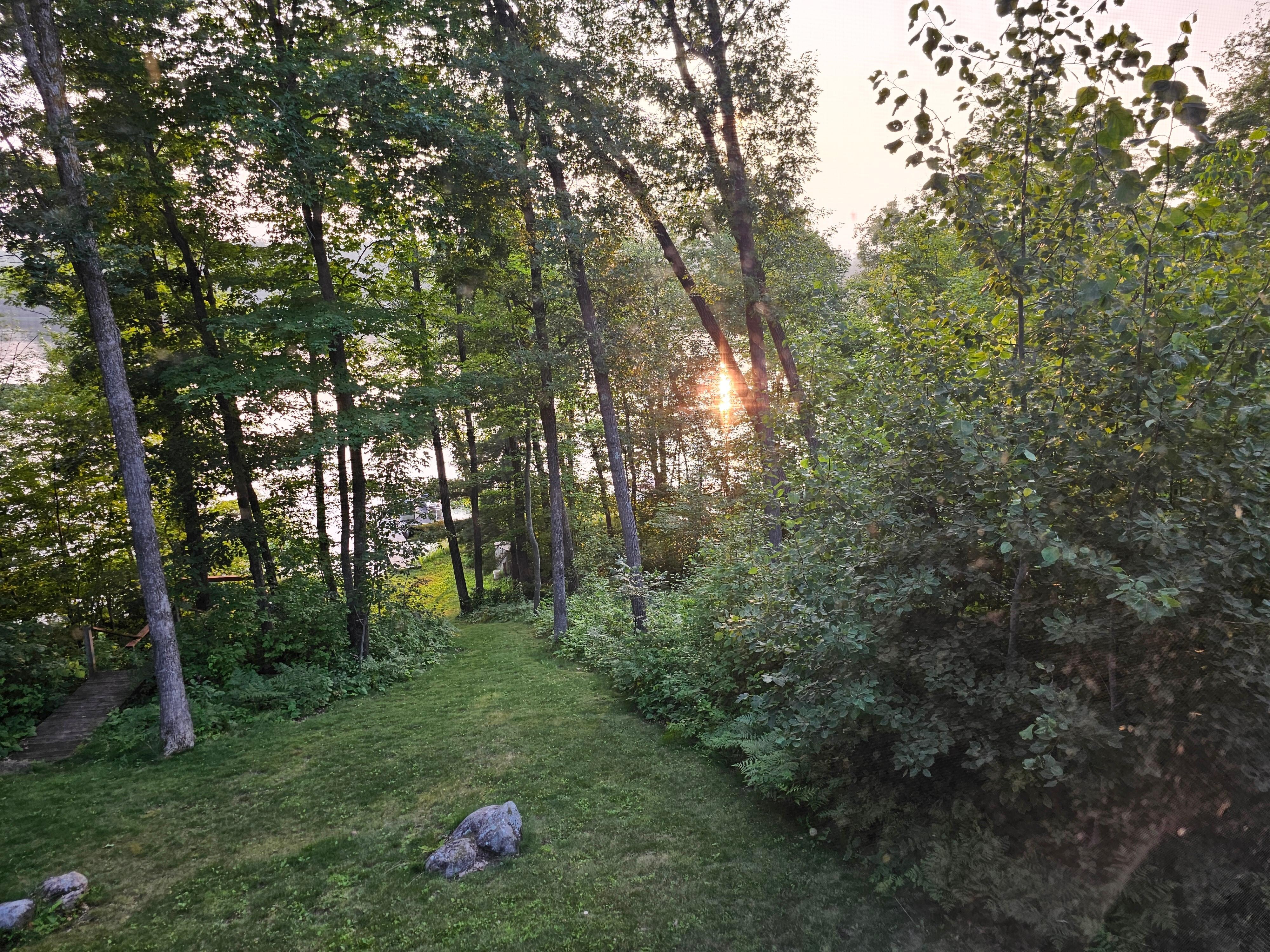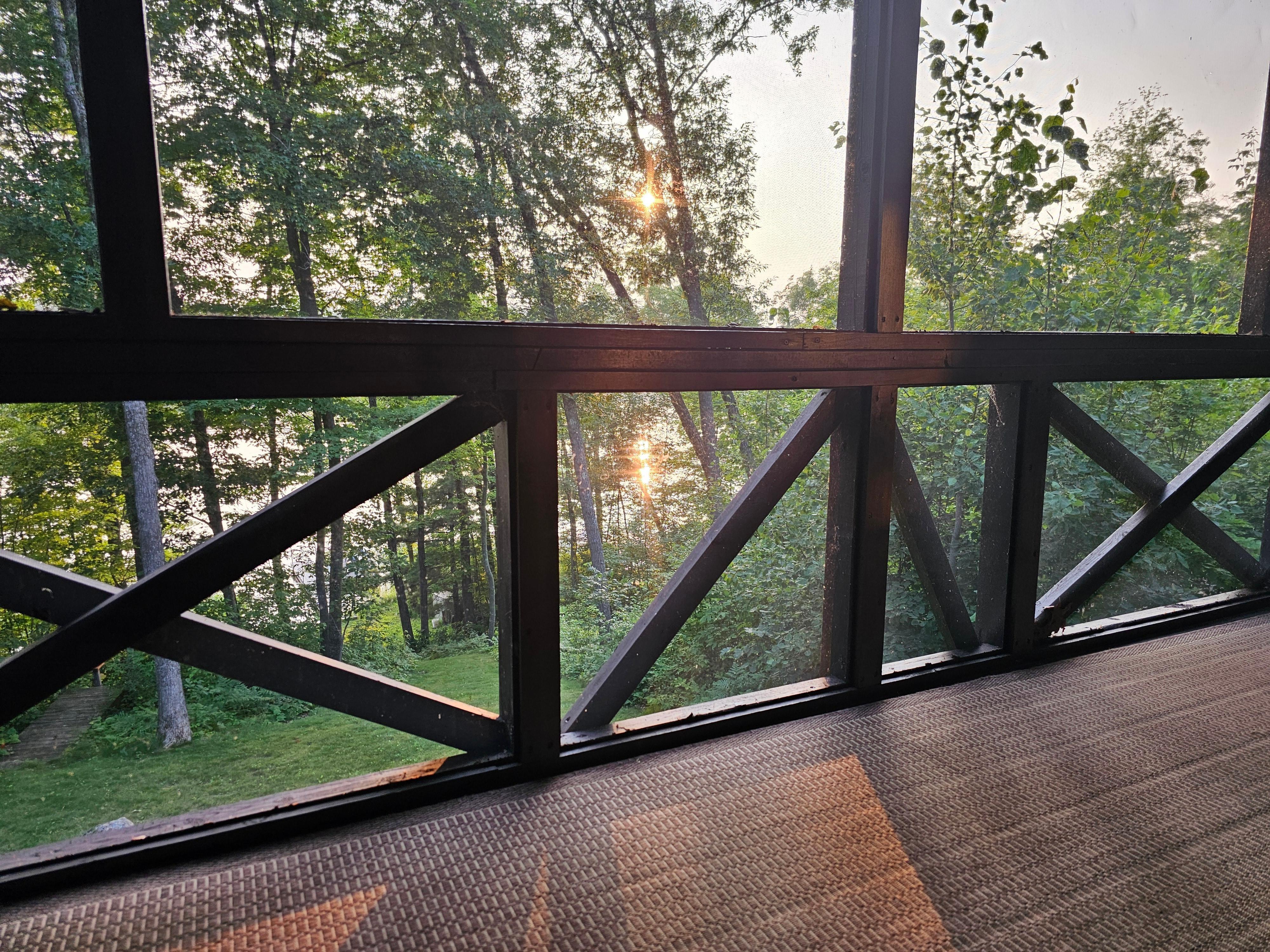 The lake is clean with great swimming/fishing, the shoreline is loaded with the purple pickerel plant. The cabin features many unique characteristics that give it a personal welcoming charm. Inside, there are two bedrooms; one upstairs with a queen and one downstairs that is a bunk with a double on the bottom and twin on the top. The cabin is fully furnished, 2 couches, rustic pine chair, coffee tables, end tables, etc... The kitchen is well supplied; plenty of large and small appliances and all the utensils you need. and yes, wine glasses and copper mule cups too!. There are lots of games and books here. The best room in the house is the lakeside screened in porch. You'll enjoy your morning coffee, mid-day nap, and evening sunsets here.