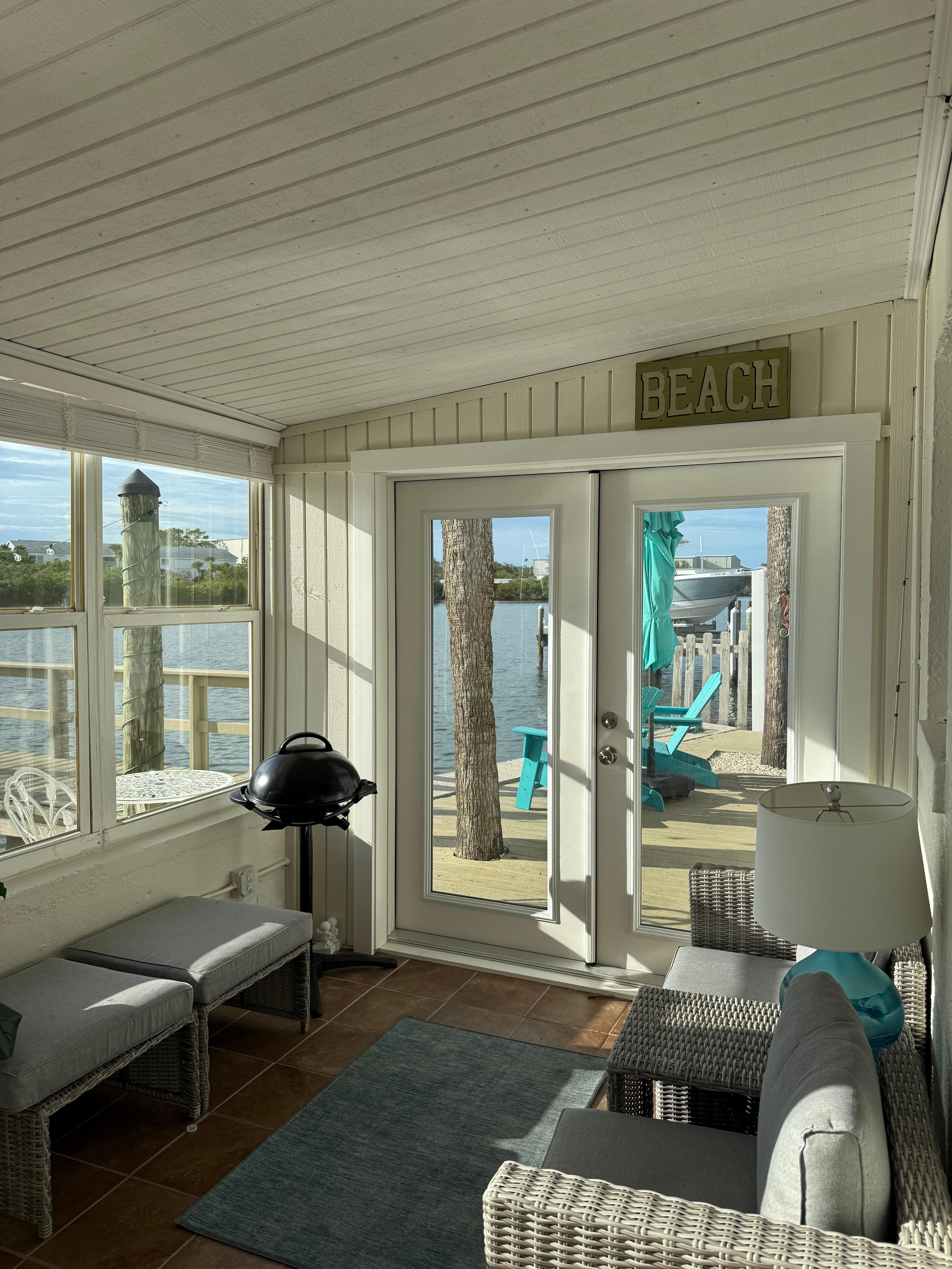 Cozy and beautifully appointed, once you're inside, you can tune out the rest of the world, and dolphin and bird-watch from the sunroom or private deck. Or, open the front door and walk to your choice of six restaurants, CVS, a brew pub, CrossFit, convenience store, surf shops - all in under 5 minutes.