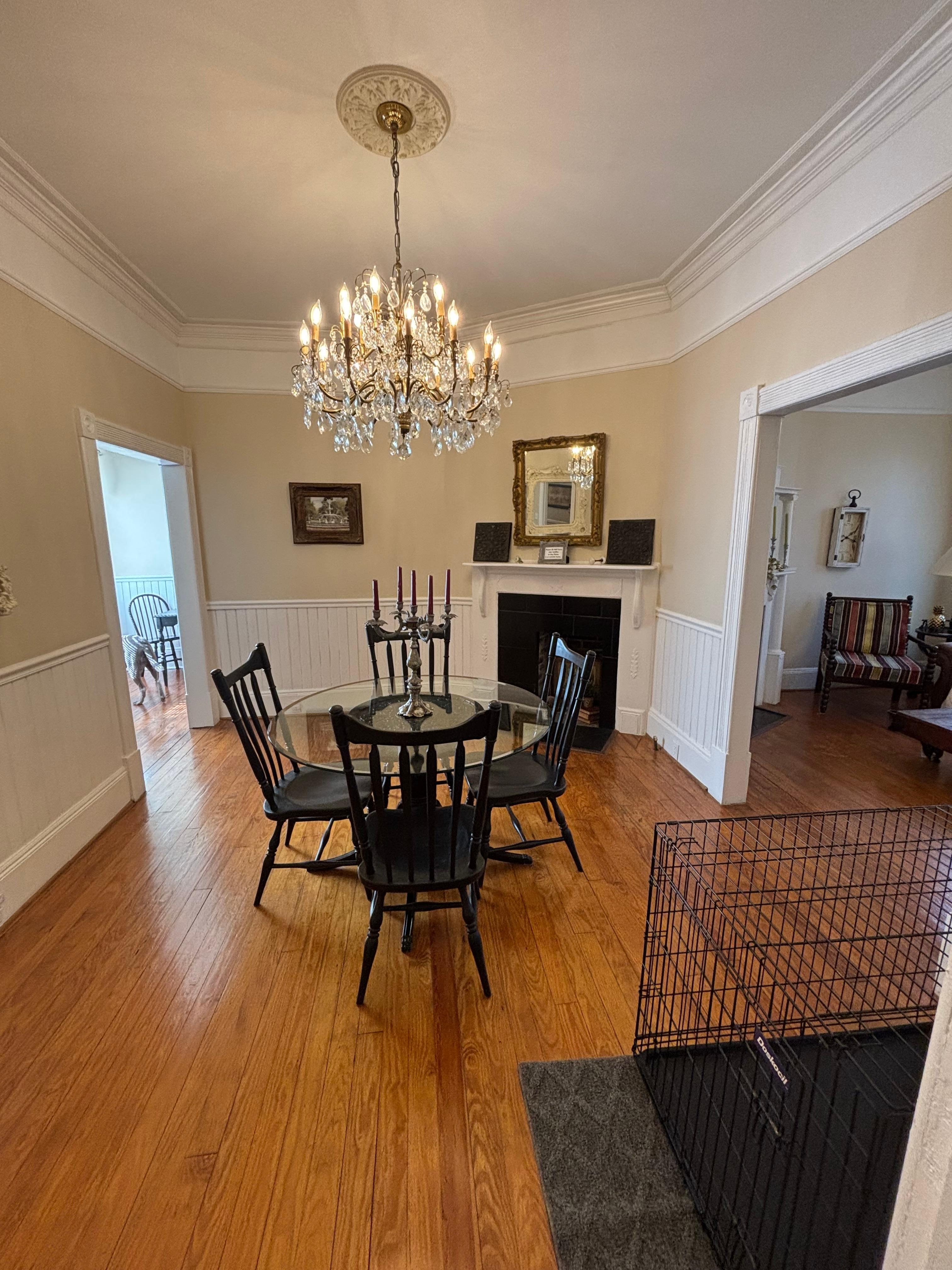 The dining room hosts a 4 seat dining table with glass top which beautifully reflects the light of the chandelier above. Across the room is a lovely Victorian double framed mirror.