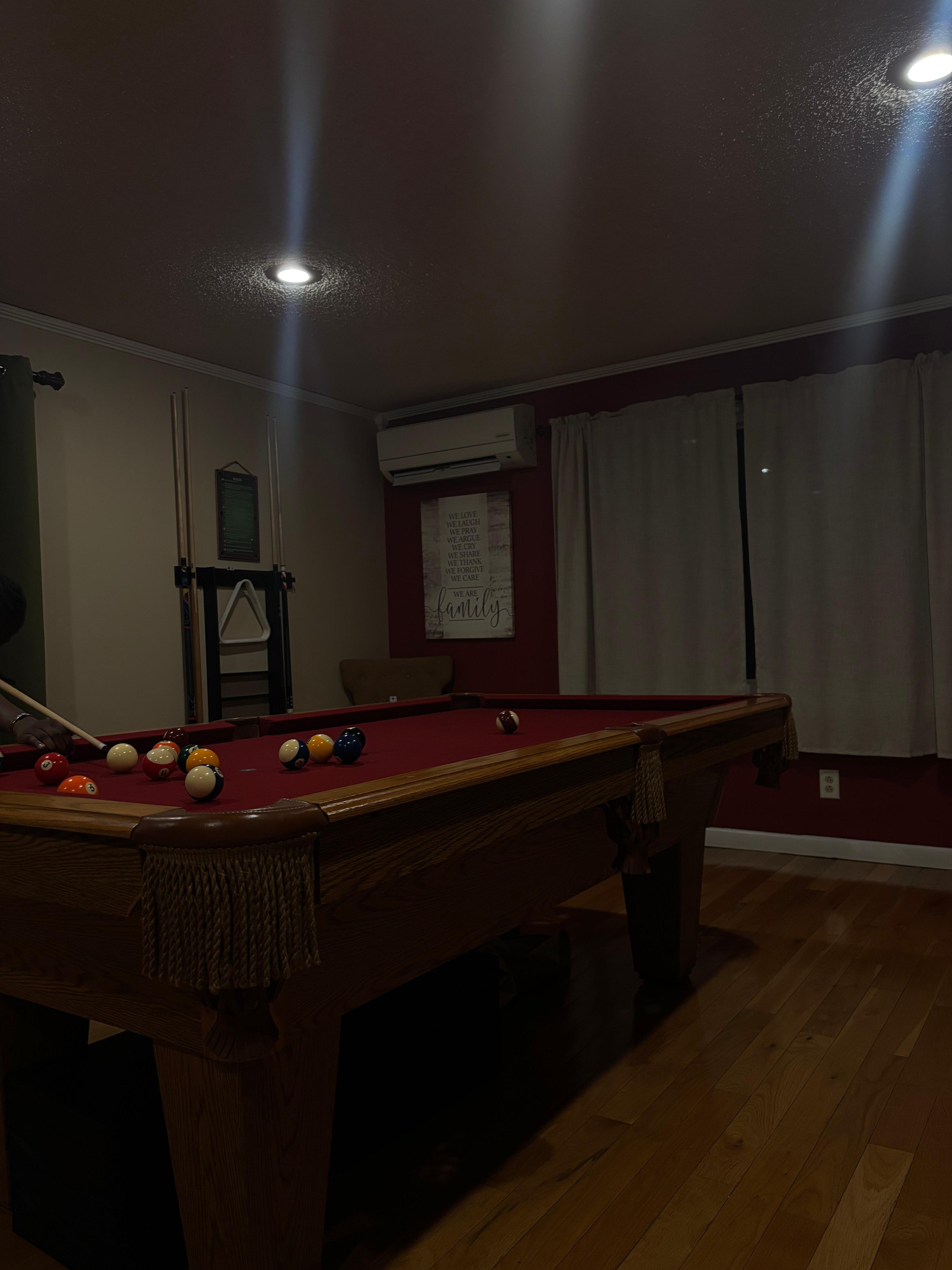 • Living room: Pool table + hangout zone