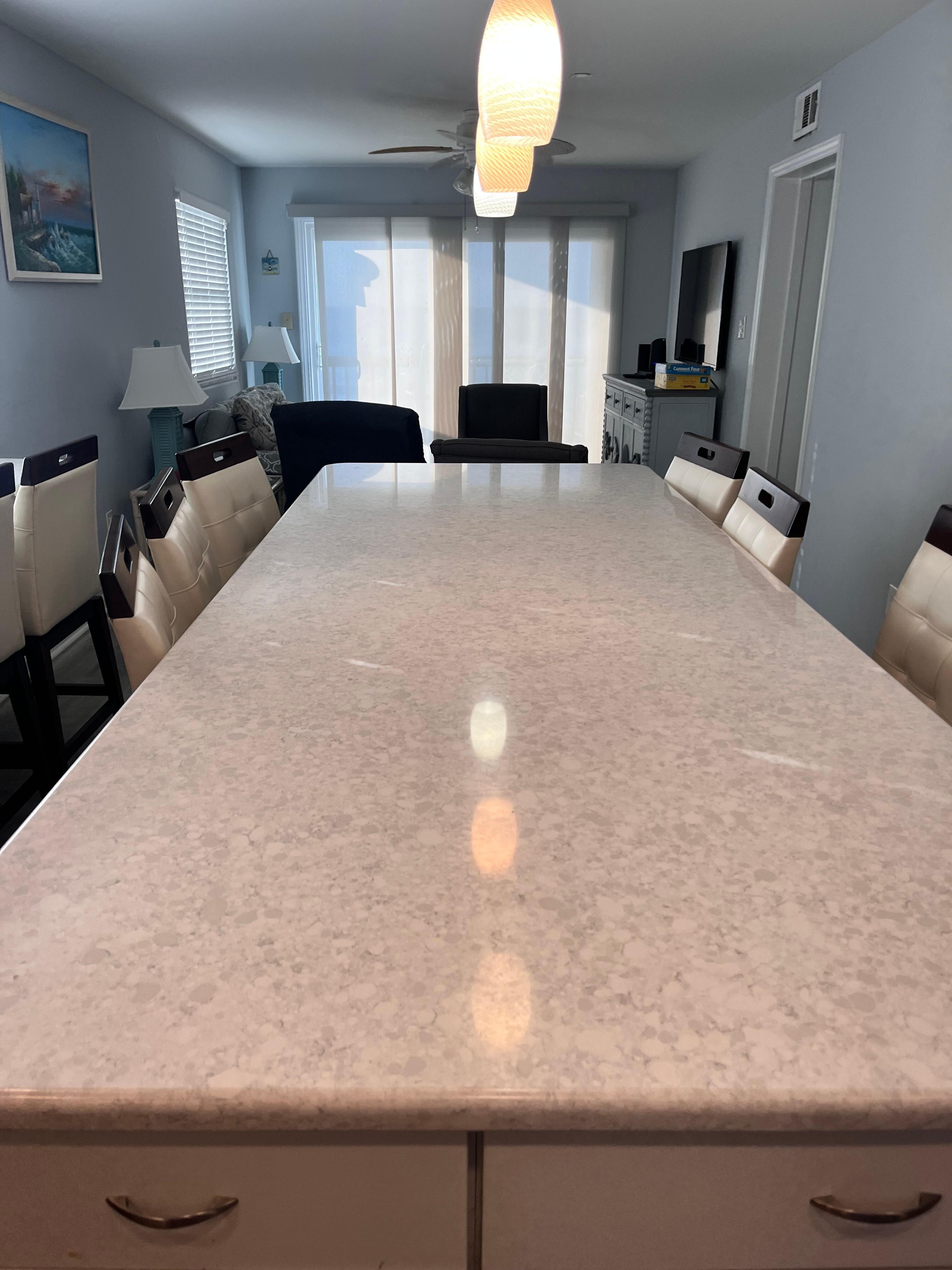 Kitchen remodeled 2018, all new stainless steel appliances and quartz counter top with 10' island and 8 chairs. Window bar added Dishwasher and microwave, all appliances necessary. Includes Keurig blenders, mixers toaster oven, and even hair dryers in each bathroom. Iron and ironing board, golf clubs the Unit Sleeps 8. This unit is right on the beach 3rd floor, large balcony, with a view of the pool and beach. Newly remodeled, sit on the deck and watch the children play on the beach or in the pool. Located 1 mile north of the Garden City Pier. 1 miles south of Surfside Pier. On site pool, Washers/Dryers, Elevator. Available weekly or monthly rates. Saturday to Saturday in by 4:00 PM out by 10:00 AM Close to Broadway at the Beach, South Myrtle Beach area 3 minute walk to Conch Café. Free WIFI and a stocked Refrigerator get ready for Sun & Fun in a family friendly community. 75' from elevator and Coin laundry, 5 step for access to the unit entry level.