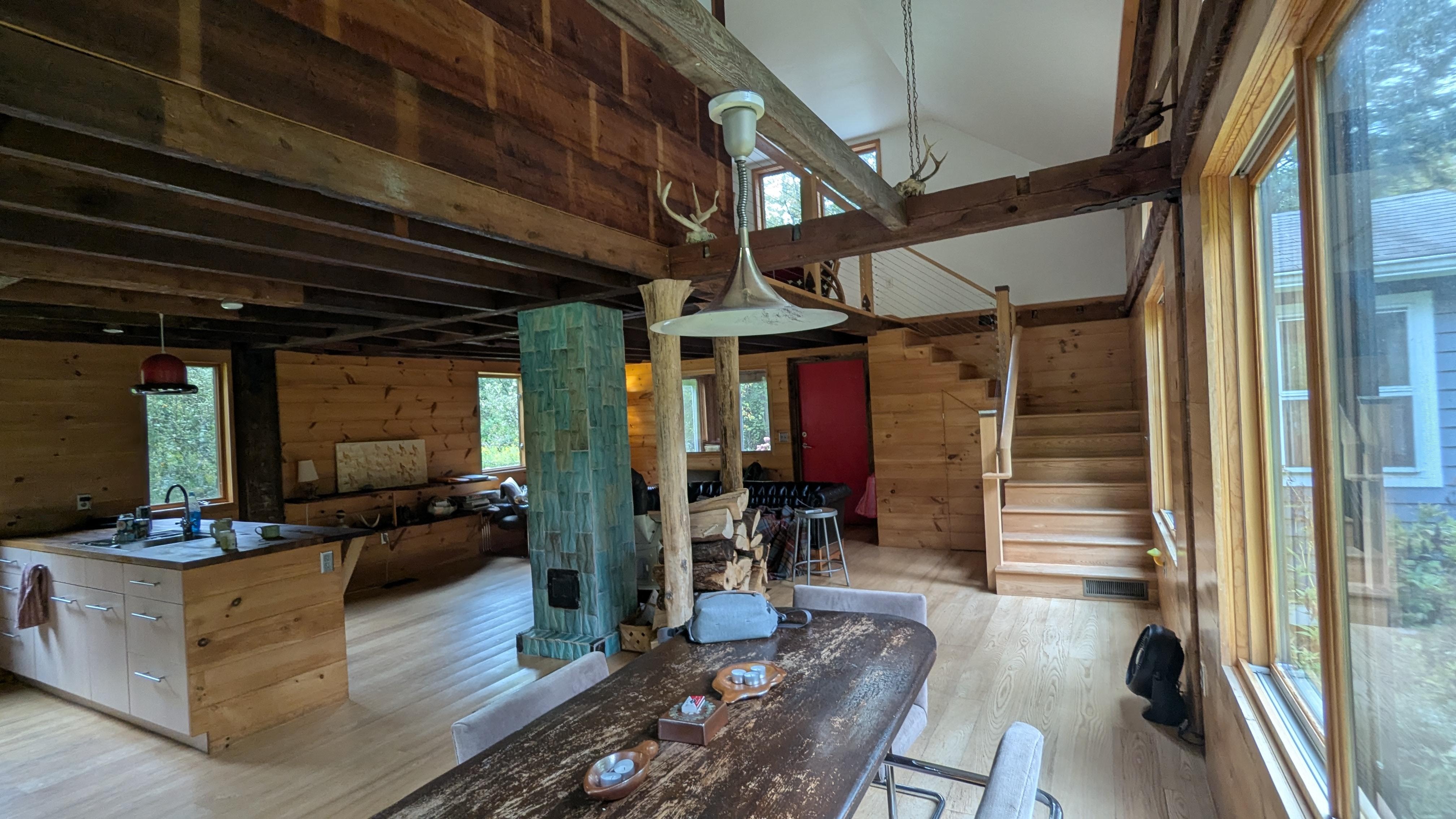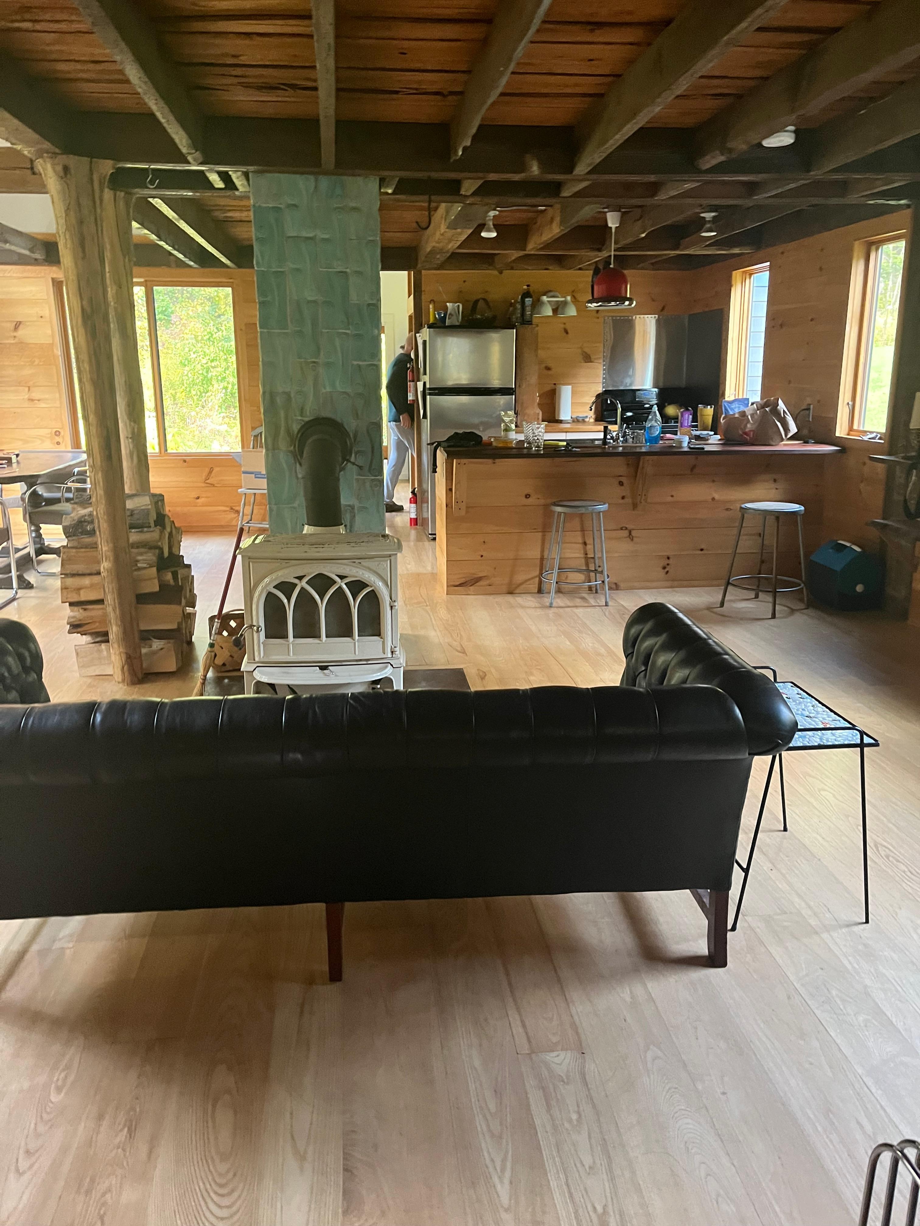Imagine getting out of your car, opening the screen door to a big porch that overlooks a leaping mountain brook, deep enough to dunk in. Then pass through the strap-hinged front door and into a glowing pine-paneled great room with giant windows, a big wood stove, 3 Chesterfield couches, dining area and kitchen. You see the forest all around you, but you're inside, ready to unwind.