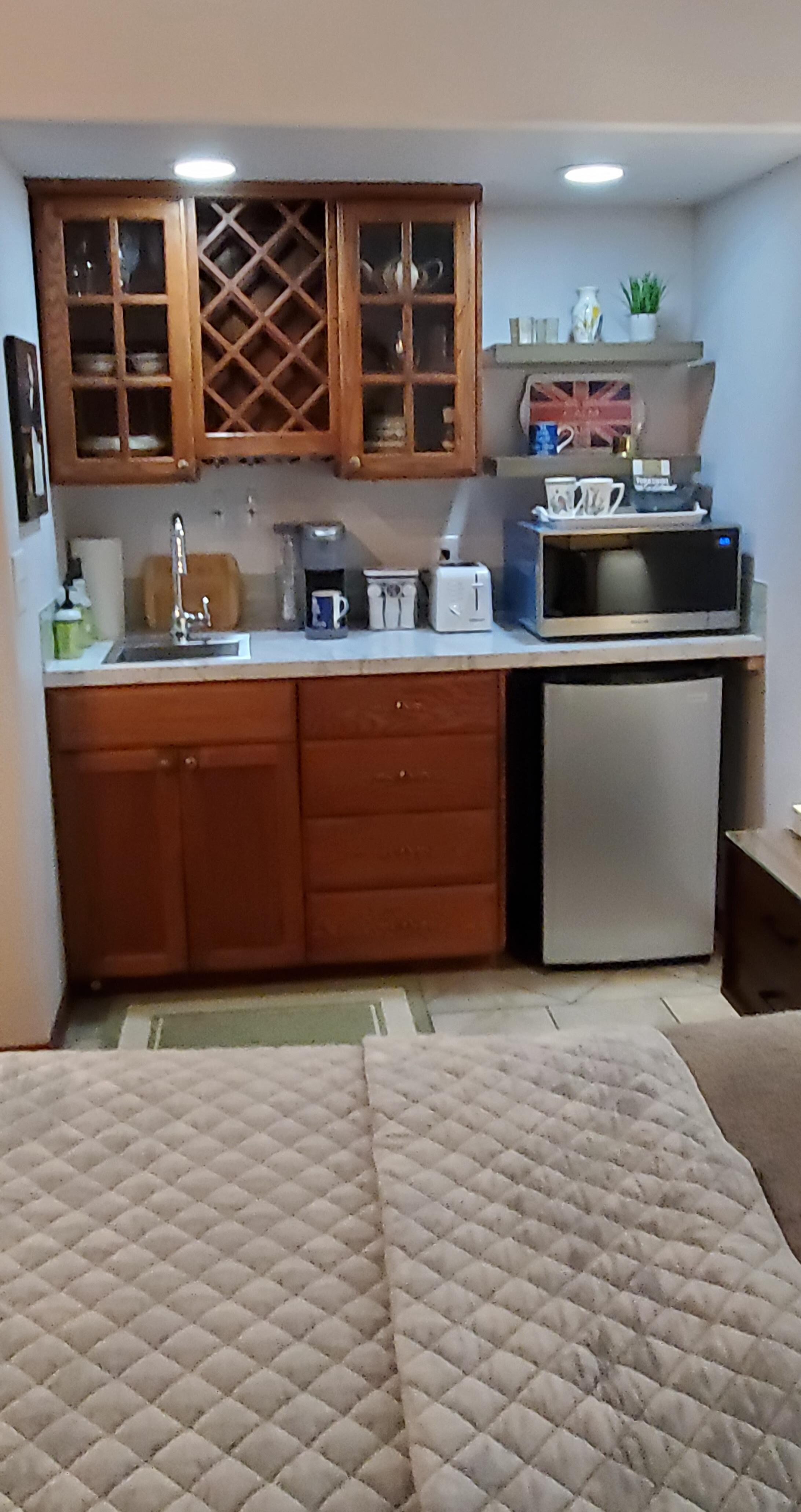 Kitchen Keurig coffee/tea, microwave, fridge, toaster.