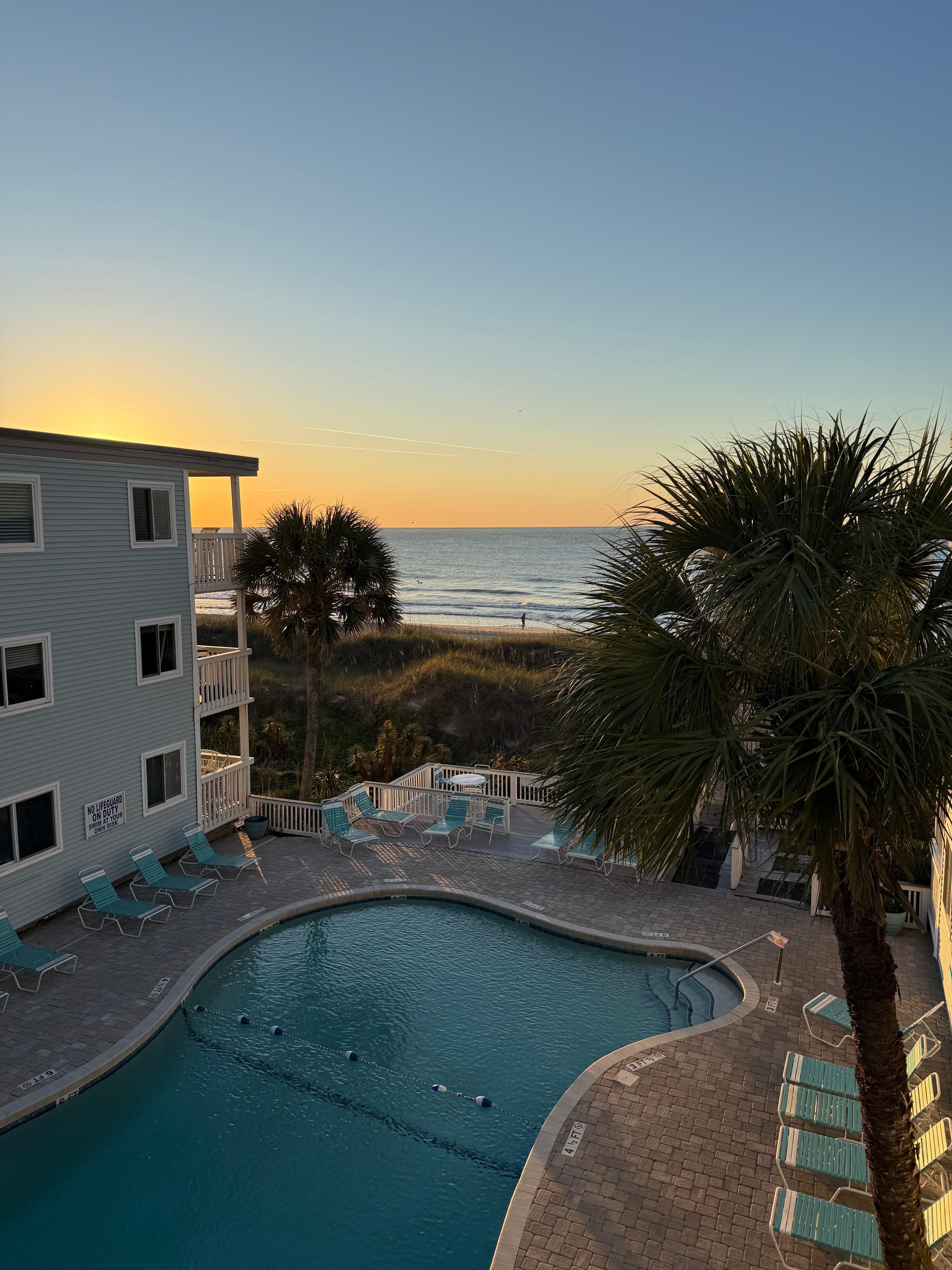Ocean Garden Villas K3 is located in a quaint and quiet oceanfront three-story beach complex in the Crescent Beach section of North Myrtle Beach, SC. While you do have to climb stairs to reach the third-floor unit, the stairs are not too steep and make it easy to reach your destination. It's a 3-flight walkup with wide stairs and landings (NO ELEVATOR). The climb will be worth it when you step into this fully-renovated oasis! This spacious and comfy condo has a living area, dining area, balcony, full kitchen with bar, washer/dryer, and WIFI. There's a large screen Smart TV in the living area. The primary bedroom has a queen-size bed, large screen Smart TV, and a bathroom with a walk-in shower. The second bedroom is oversized, with a king-size bed, sitting area, and large screen Smart TV. The second bedroom has a detached bathroom that includes a shower-tub combination. A full-sized pullout sofa is in the living area and can accommodate additional guests, if needed. There is a balcony that includes pub-height adirondack chairs to sit in as you sip your morning coffee while you enjoy a sunrise over the ocean. Your balcony also overlooks the condo pool. The outside amenities at Ocean Garden Villas include a swimming pool surrounded by a wooden sun deck, a grill and picnic area on-site, as well as an outdoor shower to rinse off after a long day on the beach. When it's time for dinner, you can make a meal in the kitchen or head out to sample one of the many restaurants in the area.