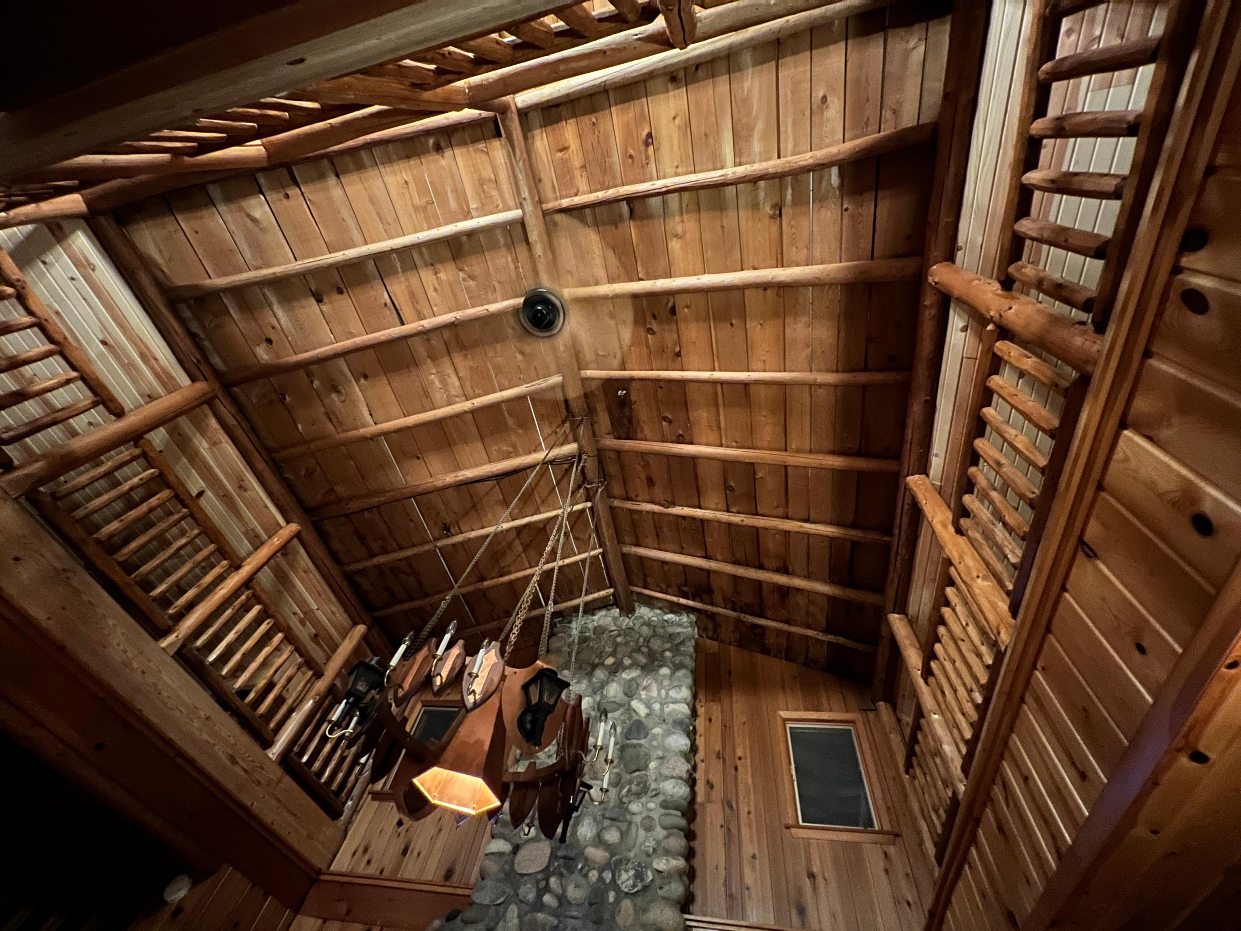 The house includes a large master bedroom with a king bed and large private bath with deep soaking tub. The second bedroom has a double bed off of the living area. The third bedroom is a loft with a queen bed and three twin beds. The fourth bedroom is above the garage with a sitting area and TV and a full bath. This is separated from the 5th bedroom by sliding barn doors. There is a third bath off the living area near bedroom two. The living/dining area is open with a vaulted ceiling and log beams with windows that look out on the lake. Total the house sleeps up to 12 - 10 adults max.