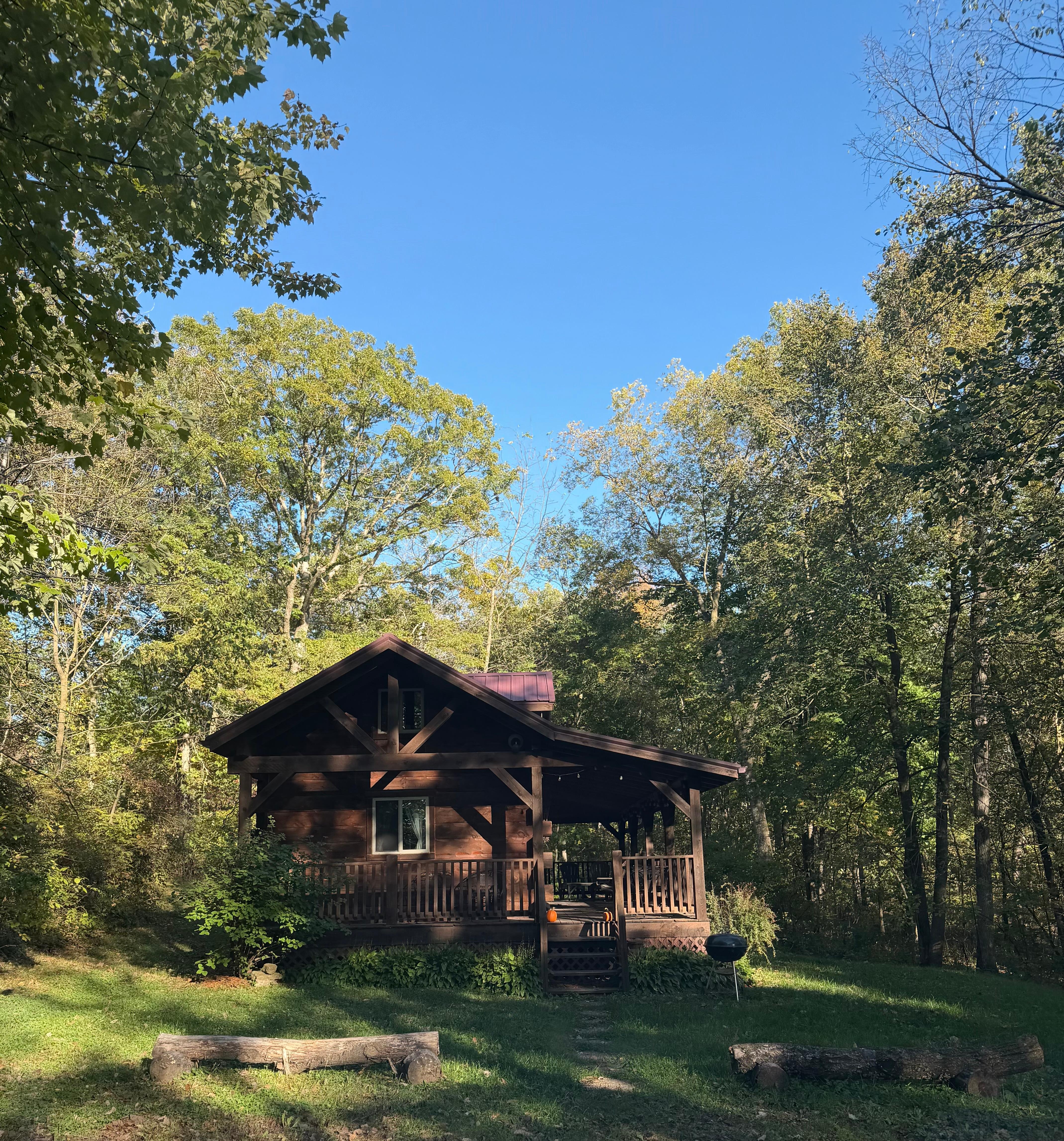 Log cabin with 1 bedroom & loft; sleeps 4 people. Main bedroom has a queen size bed, loft has 2 single beds, main living area has a queen pull out sleeper couch. One bathroom with walk in shower. Kitchen has refrigerator, electric stove, dishwasher, microwave and coffeemaker. Main living area has a comfortable couch, rocking chair, coffee table, 2 end tables, TV stand with a Roku enabled smart TV ready for your streaming subscriptions. The smart Tv has Basic antenna and Roku channels, a DVD player & DVD collection. Wireless Wi-Fi is available throughout the cabin. The outside amenities include a beautiful deck, lawn furniture, campfire pit (wood provided) and charcoal BBQ (charcoal not provided). This cabin is located in a private wooded setting on the corner of our 28 acre maple syrup farm.
