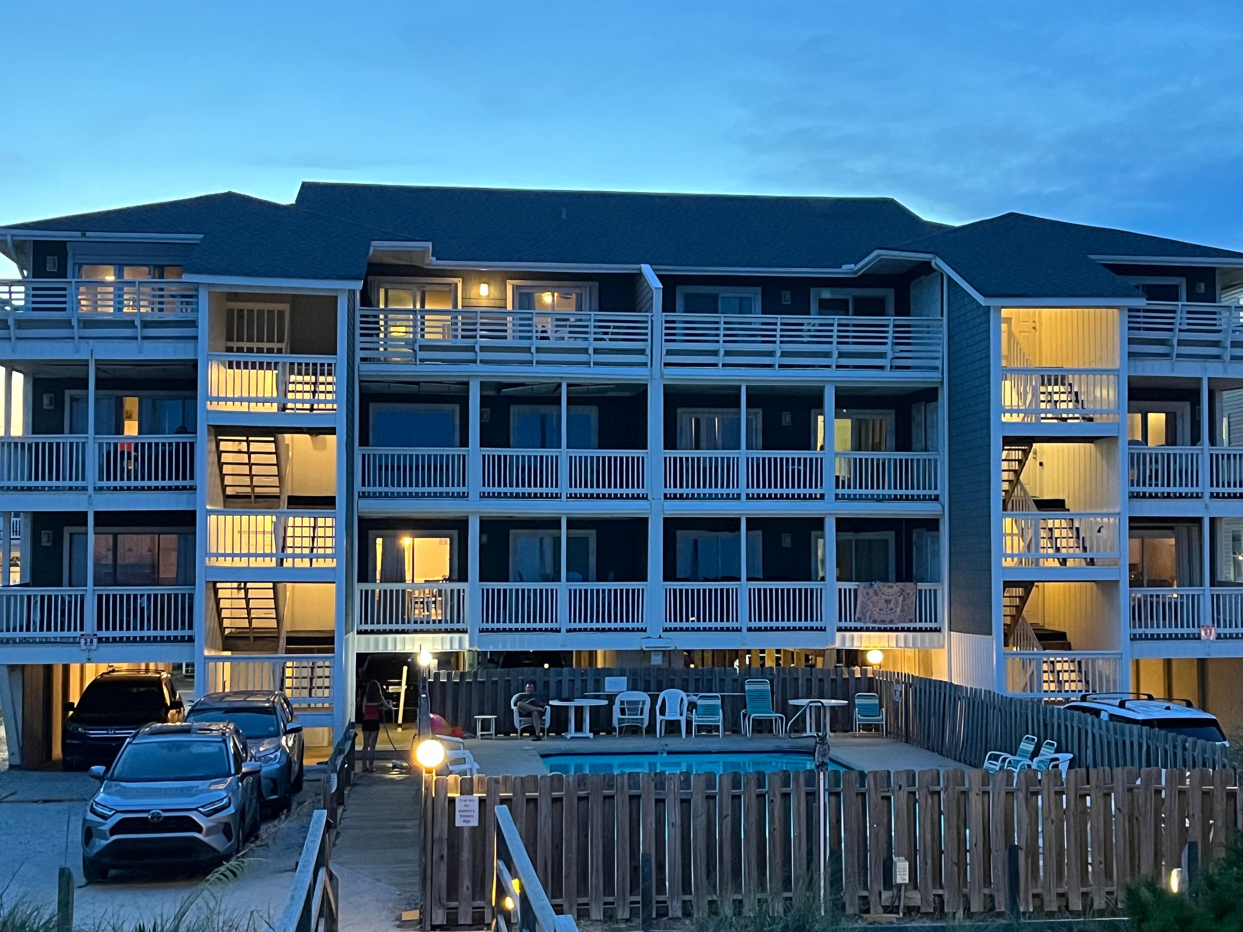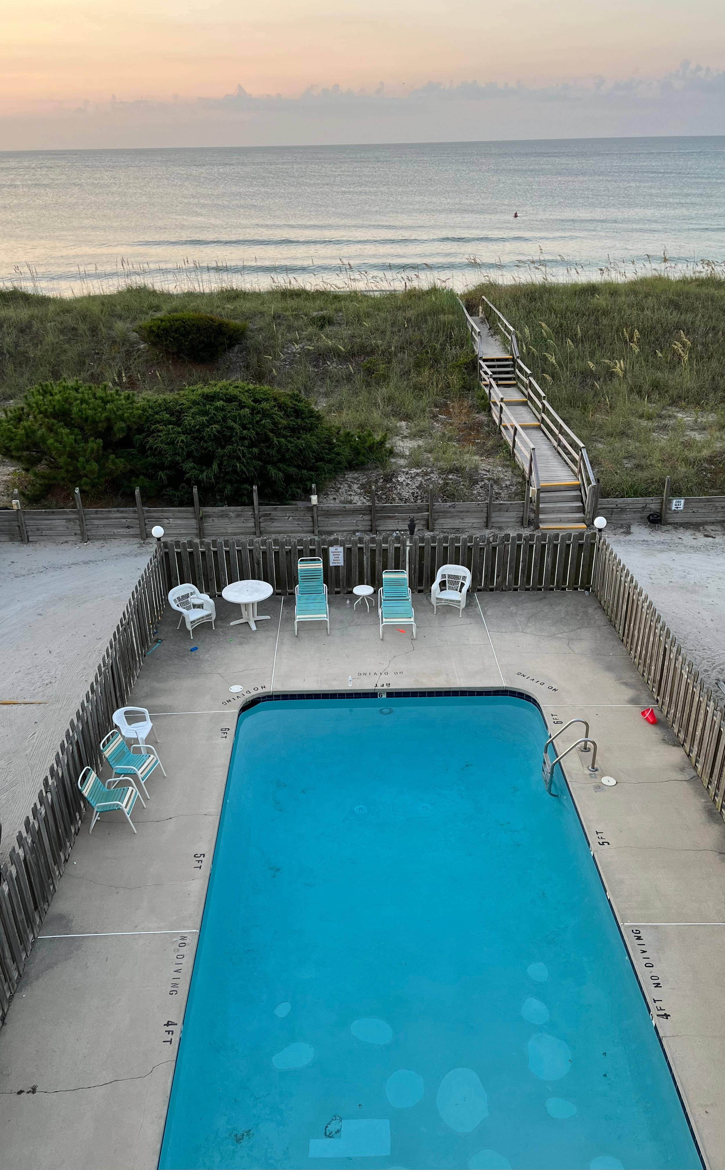 We have stayed at various locations in Carolina Beach for many years now. This is a great location. The traffic is better than on the main strip and it’s easy to back your vehicle into the carport so you can pull straight out. One caveat, be sure you are able to track three flights of wooden steps as needed. We are in our 60s so we managed, but it was a bit of a challenge. Especially with all of our gear.Our granddaughters are 7 and 10 and the ocean at this area was easy to walk out into especially at low tide. The beach is exceptionally clean as is the swimming pool, which is also a very comfortable temperature.The condo has recently been turned over to new owners, and it had new pots and pans, which I appreciate because I prefer to cook rather than go out.The bathrooms had plenty of hooks for towels, which was very much appreciated. The deck is wonderful to eat our meals in the evenings. In the mornings, even if it was raining, I could sit in the swivel rocker in the living room and watch the ocean.If scattered showers, keep you off the shore, there is Shipwreck Neon Mini Golf and Squigley's Ice Cream & Treats very close by.(i’m having trouble adding photos so if it turns out that they’re in there multiple times, I apologize.)