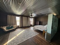 The upstairs loft-style unit provides a rustic space with modern conveniences scattered throughout, including a king size bed. And that lean.... is about 2 1/2 degrees. The floors are the original hardwood so they can be a bit rough in some areas. Walking barefoot may cause some discomfort.