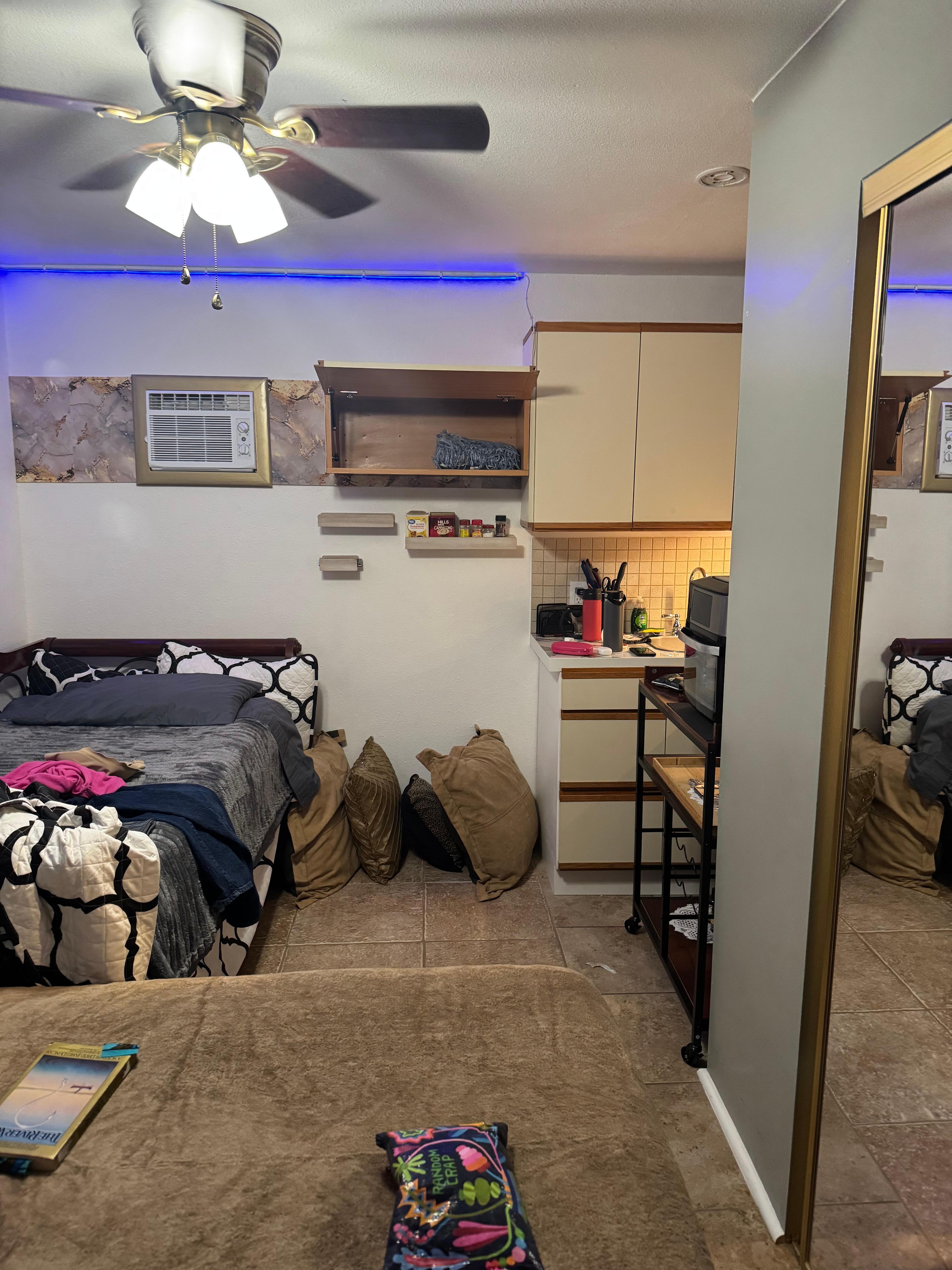 This delightful Studio in East Mesa, is a cozy retreat for guests looking for a comfortable stay. With a lovely bedroom with a Day Bed, 2 twin beds with good almost new mattress, a nice bathroom with a shower and hair dryer, Amenities like WiFi, TV, AC, pots and pan, refrigerator, Air Fryer, small Stove, microwave , a littler Vintage Closet, Porch w fence, this gorgeous space 355 S/F, has everything you need. Whether you're relaxing in the Pool or exercise in the fitness on The Club House, this charming studio is the perfect spot for your trip. Very close to Everything. We're happy to assist with any questions while you stay at our studio with private Entrance and Quiet. Has a one small fence if you have a small dog, please, no more than 10 pounds, for more Security.