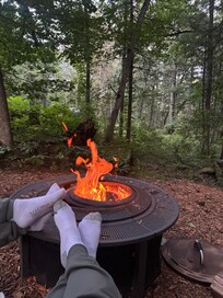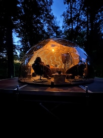 The dome itself is cozy and inviting, with all the amenities you need for a comfortable stay. A comfortable bed, nightstands, a seating area, small refrigerator, coffee maker and a "Dome-a-Loo"(portable toilet for any nighttime emergencies) are all thoughtfully arranged within the dome's circular walls. This dome is set on a wooden platform and just outside your door you have a private fire pit, small charcoal grill and chairs to enjoy a warm fire and relax with a beverage. Your full size bathroom is just a short walk up the pathway.