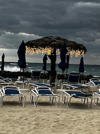 Large semi-private patio equipped with furniture and large garden area that is fenced. Perfect for kids to play while adults relax on the patio. Steps away from a swim up pool bar "Lazy Lizard", waterfall feature with mini lazy river, kiddie pool and BBQ area. From the pool, it is minutes to the beach that is equipped with loungers and umbrellas (first come first serve), outdoor shower.