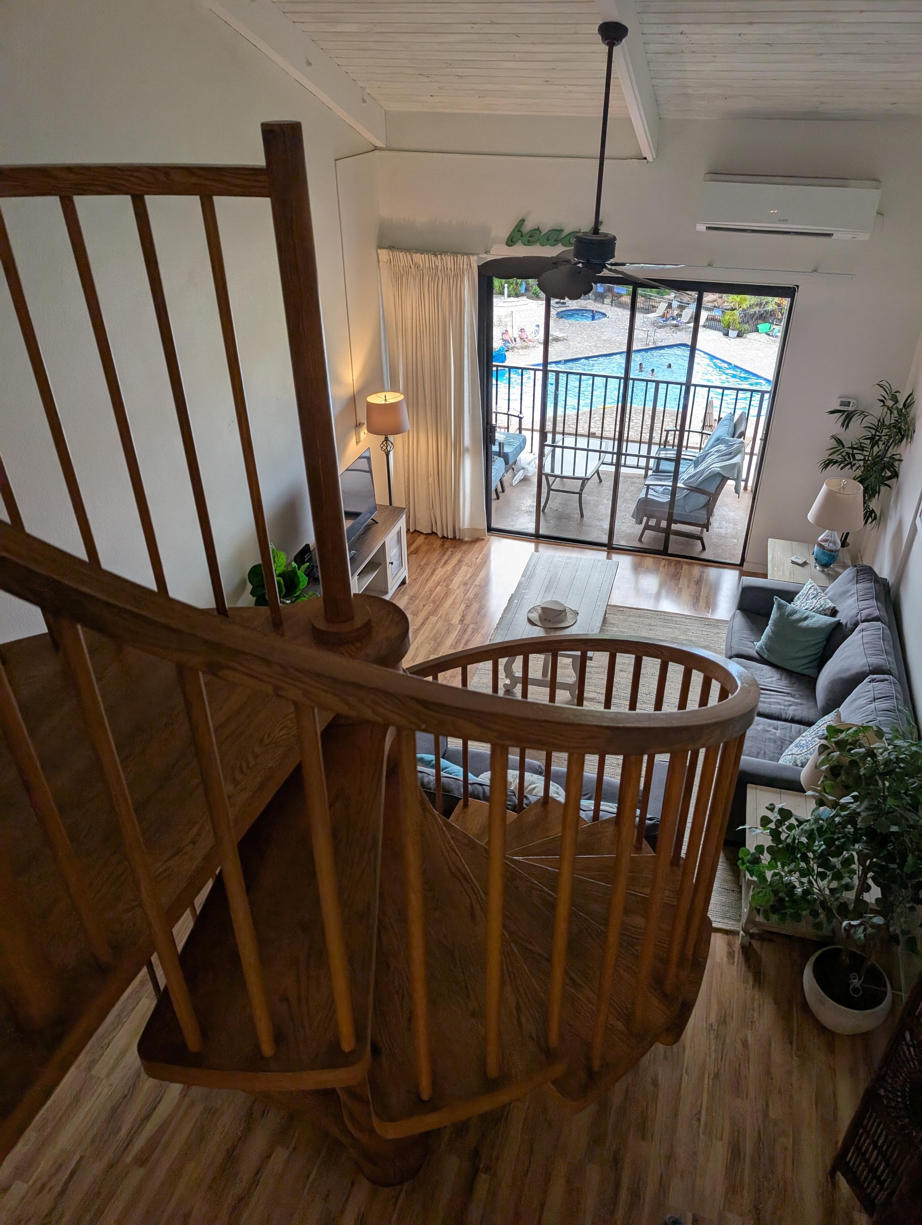 •Unit Equipment: This is an oceanview 2-bedroom, 2-bathroom, fully-furnished 1200 sq.ft. penthouse condo equipped with full kitchen, including stainless steel appliances. The condo has air conditioning units in the open concept living/dining/kitchen/loft area and also in the main floor bedroom, plus 4 ceiling fans throughout. The lofted primary bedroom has a vaulted ceiling, king bed, and private ensuite bathroom, and the main floor bedroom has two newer twin beds that convert to a king upon request. The unit has a phone that connects directly to the front desk and offers free local phone calls. The unit is equipped with high-speed wireless internet.