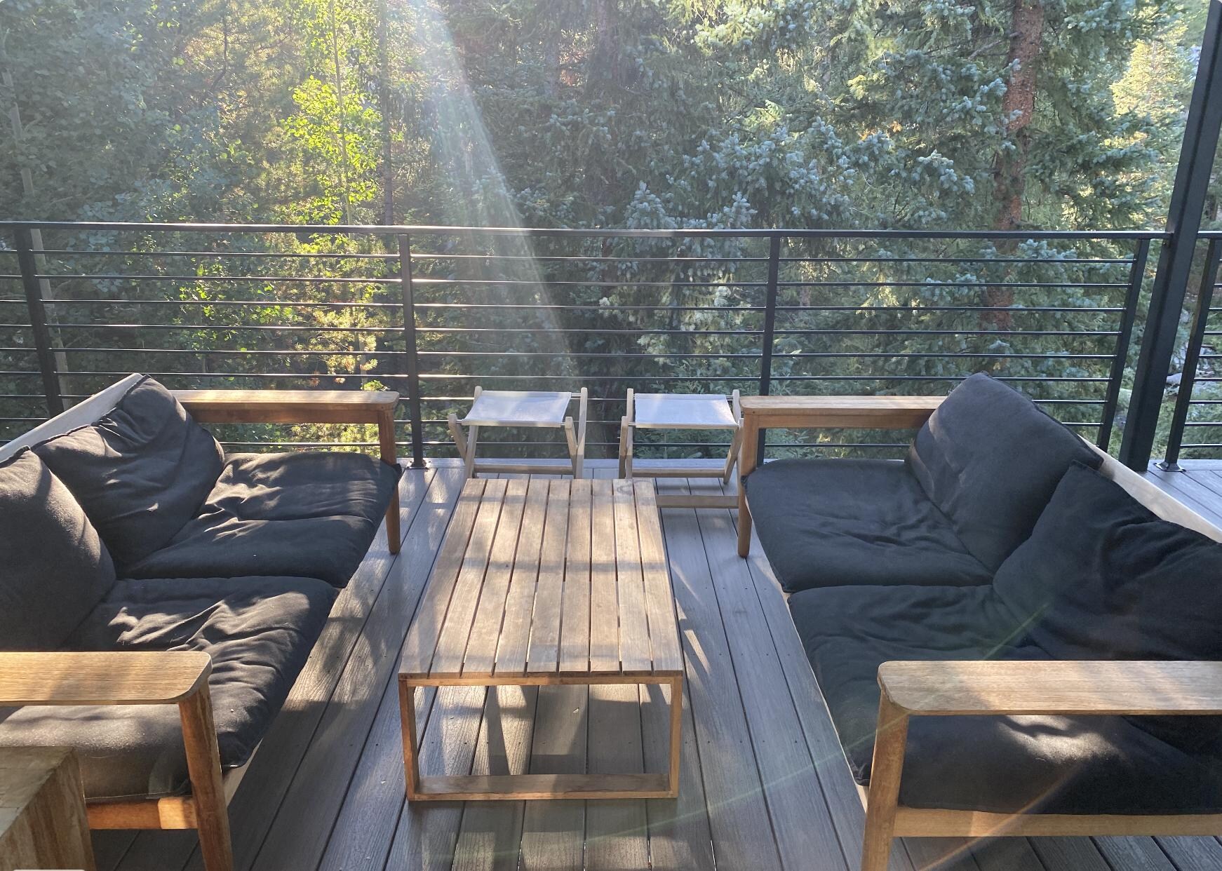 The upper-level office area, which overlooks the creek and pine forest, offers a tranquil workspace with inspiring views… or maybe you just want to take your book or laptop out on the more private top-floor deck.