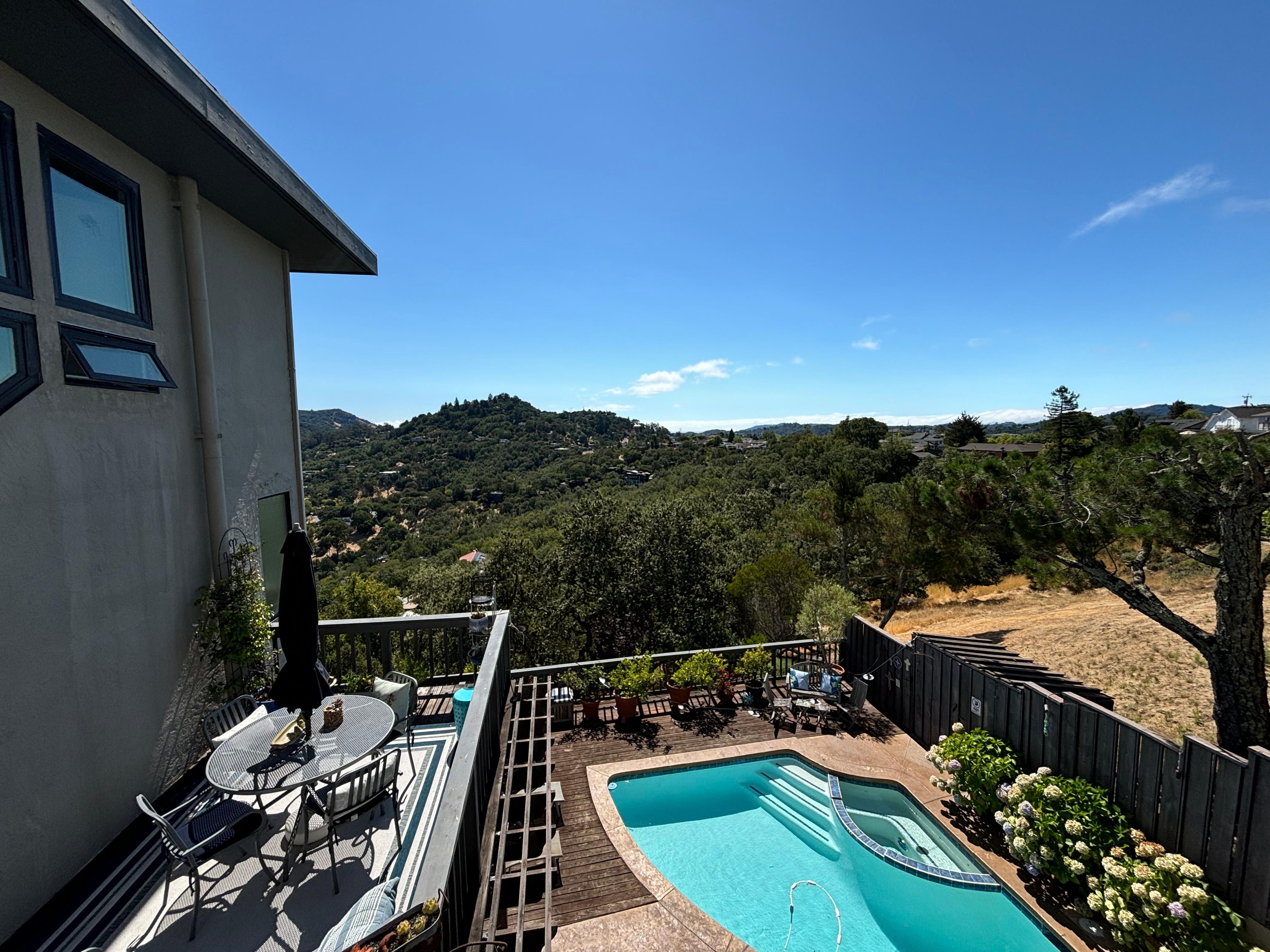 Our home is located in a quiet, upscale neighborhood. 18 steps lead to this attached in-law unit, which features many amenities and unique privacy. Another 12 steps to a semi-private swimming pool, hot tub, and deck, featuring nearly three-hundred-sixty-degree views of the Bay and Mt. Tamalpais.