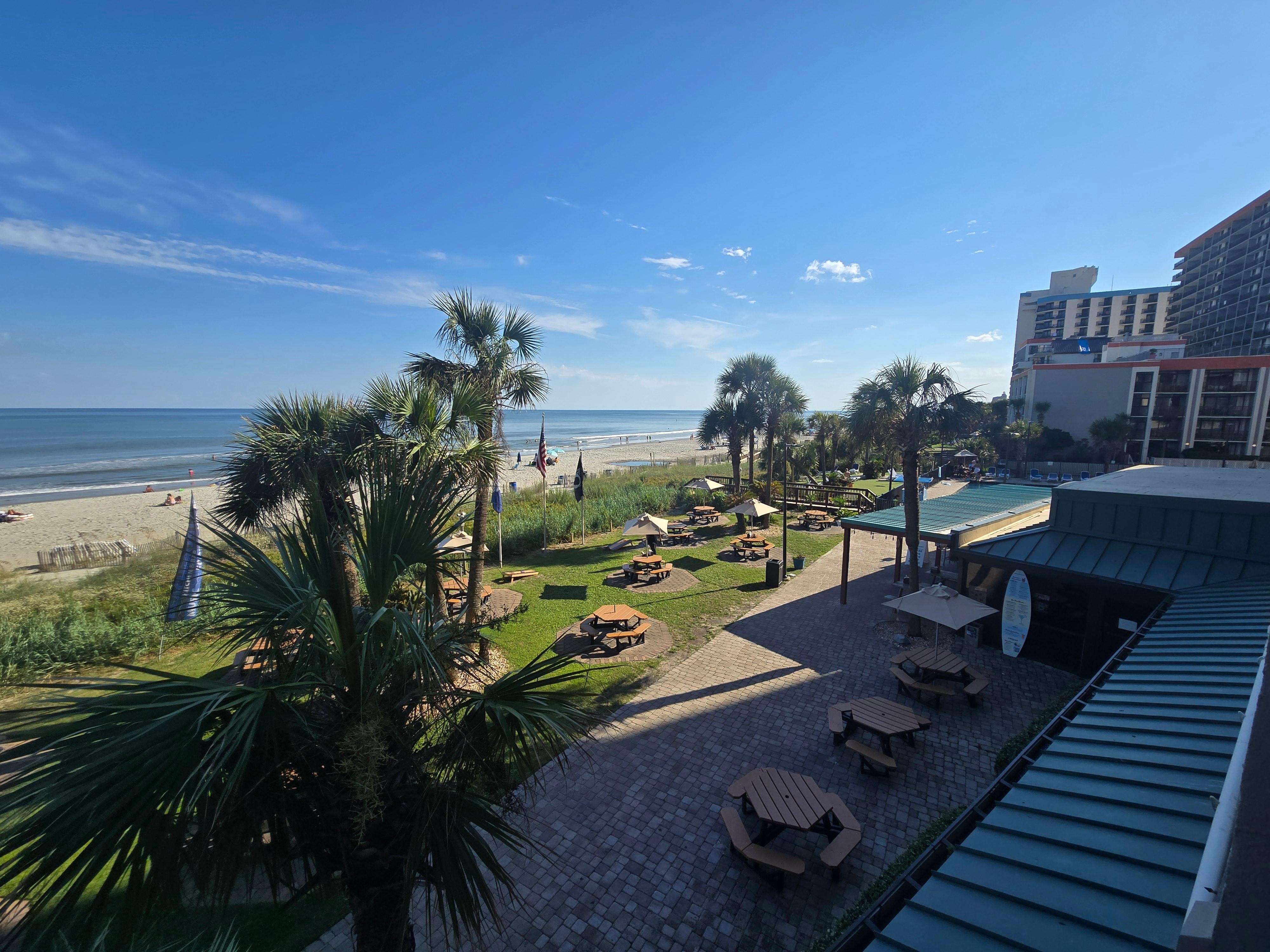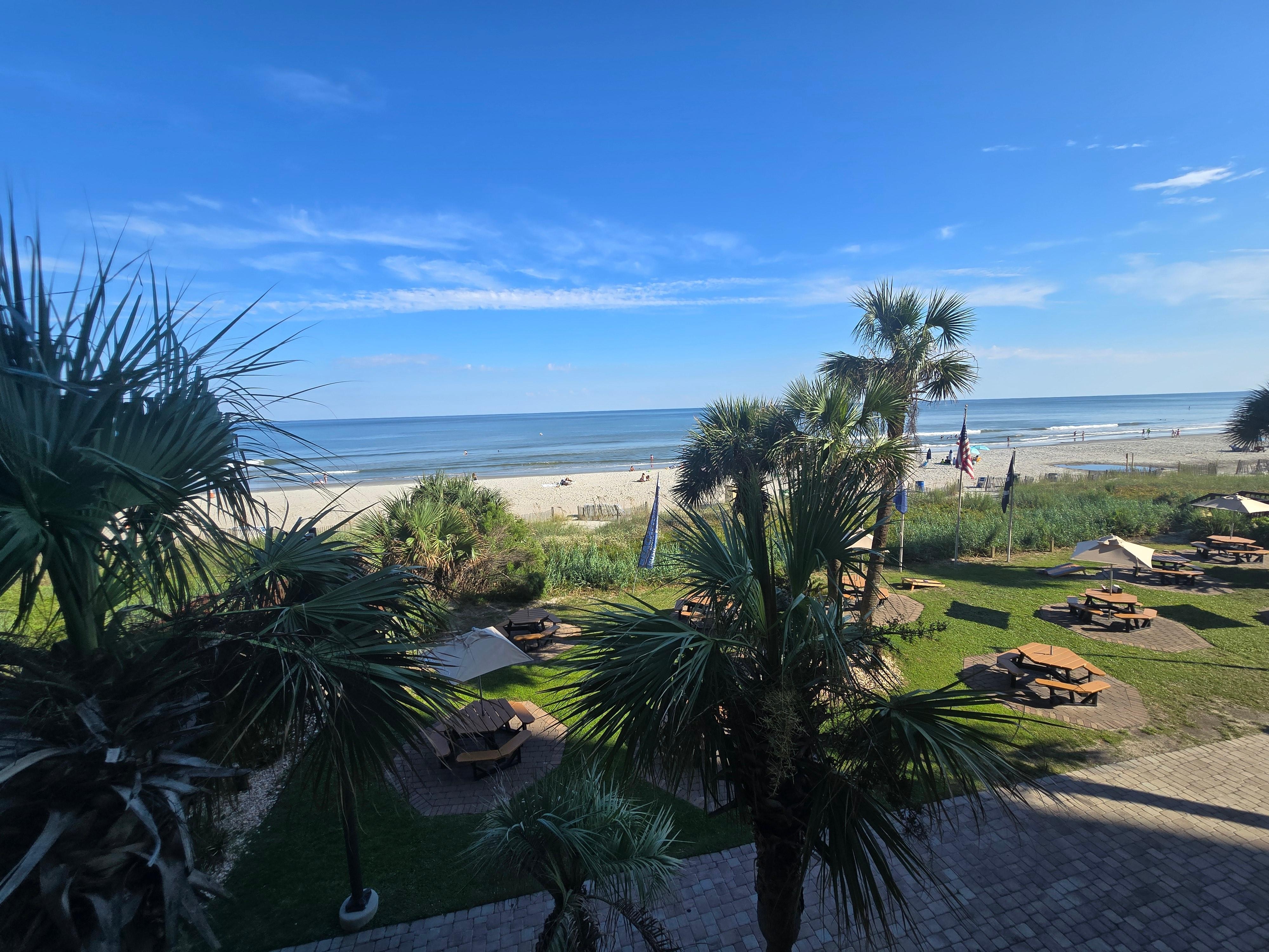 LOOK AT THE AMAZING VIEW! Enjoy this tropical paradise that is direct oceanfront! There are very few units where you have the view of the palm trees, the beach AND the ocean! You can lay in bed and see and hear the ocean. This unit has many upgrades. Located at the Sand Dunes Resort on Myrtle Beach's Golden Mile (74th Avenue North), Unit 232 on the second floor will become your new-found paradise. Have coffee or blender drinks on the balcony overlooking the beach, ocean and patio; relax in bed while listening to the waves; sit in the cozy chaise lounge reading a book or watching for the dolphins, or sit at the table to eat or watch the action on the beach. Enjoy the luxury of new furniture, an amazing rock wall behind the bed, new tile throughout, an upgraded 51' flat screen TV, new bed, and high-end linens.