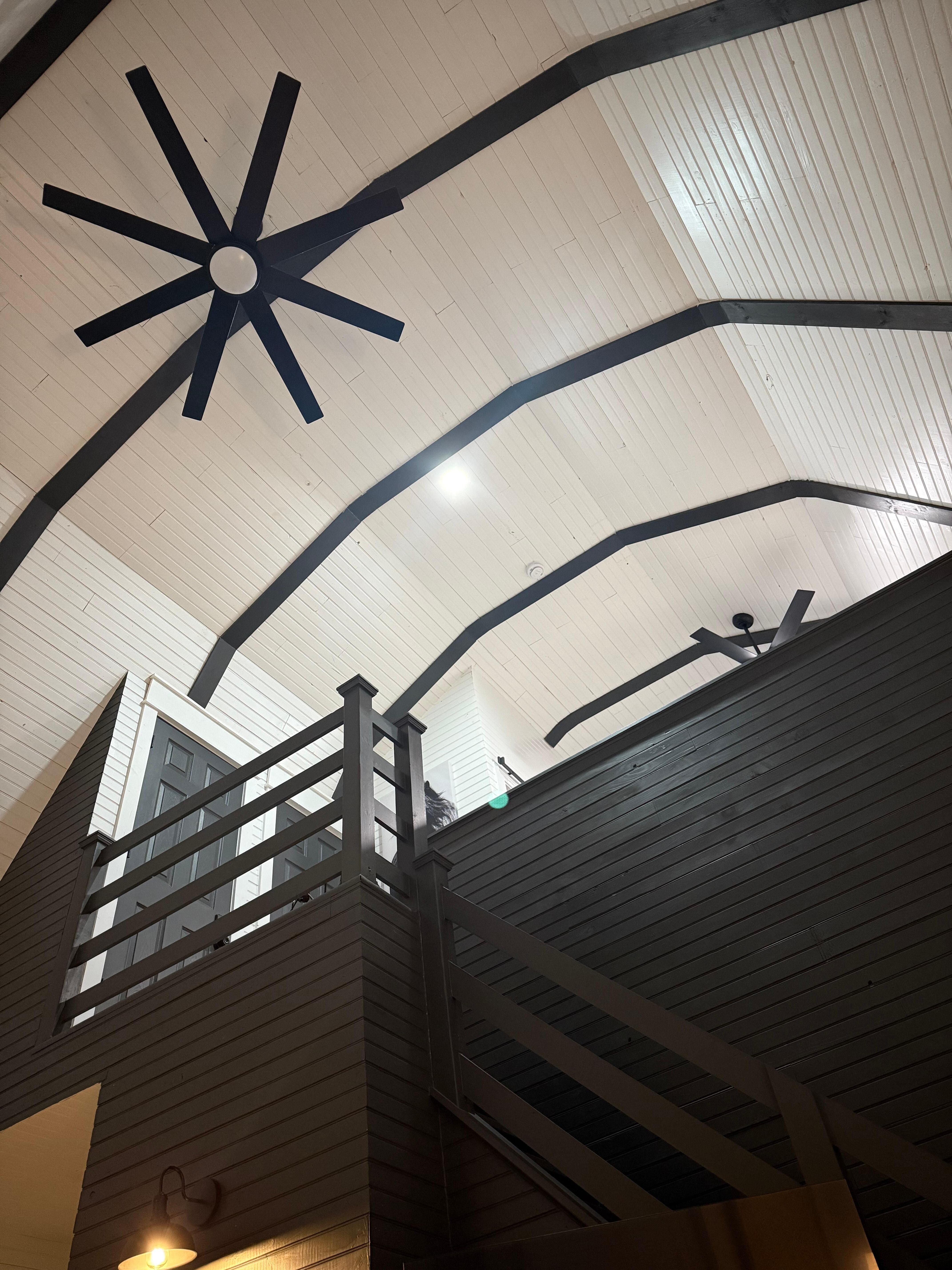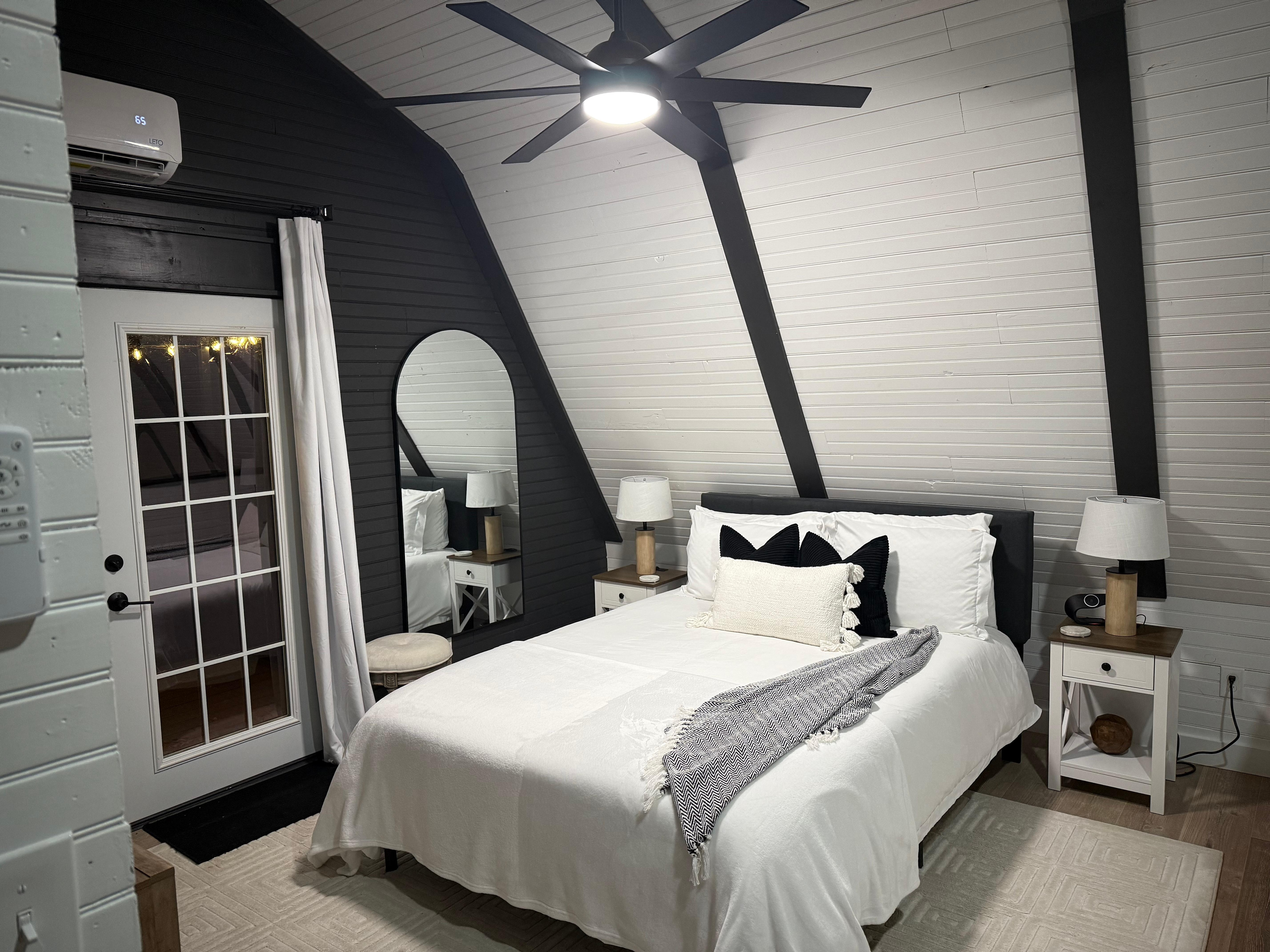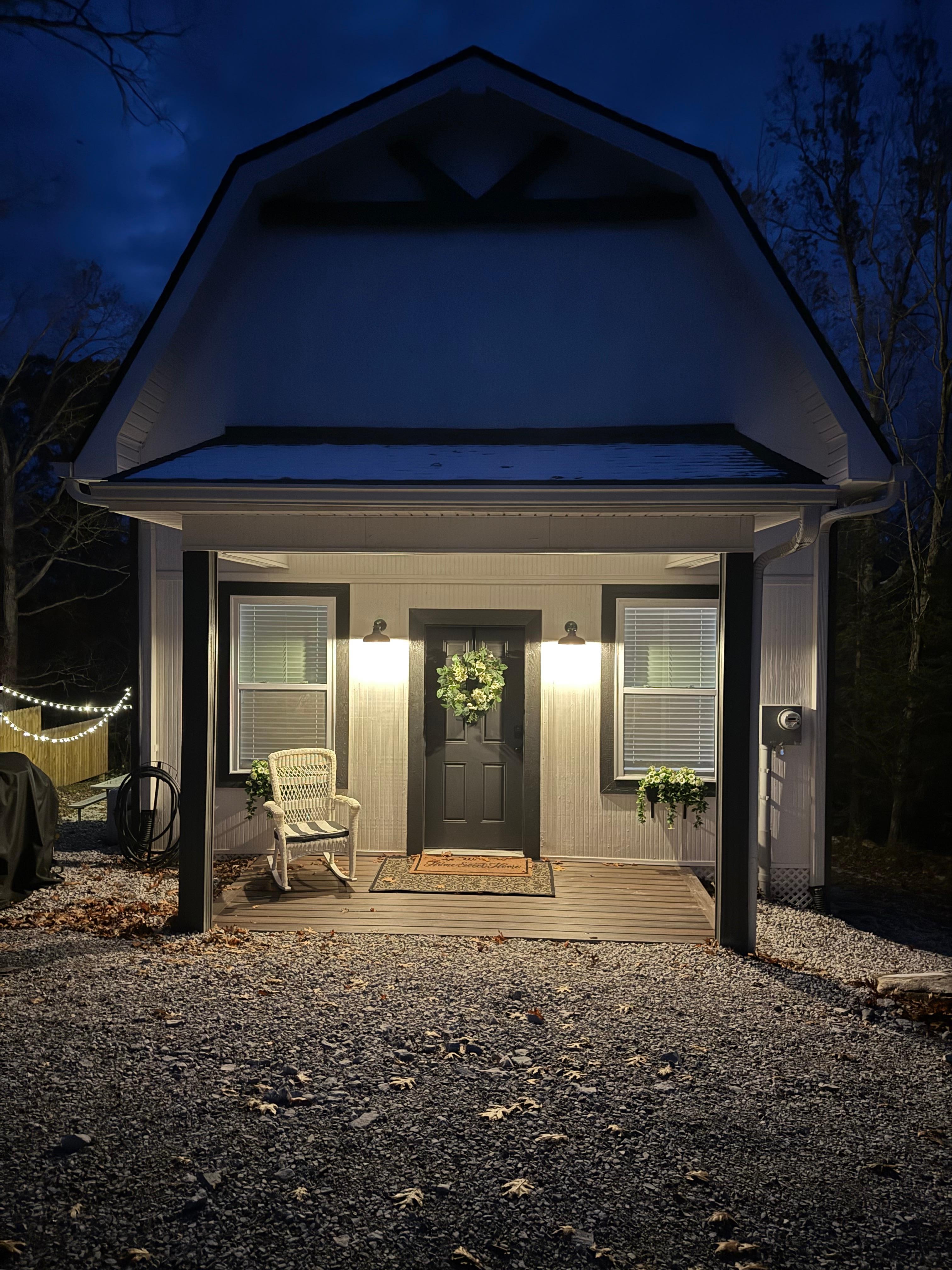 Set on 4 quiet, wooded acres just 15 minutes from the Ark Encounter in Williamstown, Anders Cabin is a 700 sq ft two-story retreat that gives you the feeling of being nestled among the trees—with bistro lights above and cardinals flitting through the branches around you. This modern cabin is thoughtfully designed with intention and warmth—featuring a striking black-and-white interior, nearly 20-foot vaulted ceilings, and peaceful forest views just beyond the windows.