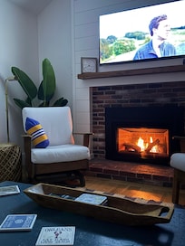 Relax in the bright vaulted living space with exposed wood beams, a plush sofa that converts to a queen bed, and a striped coastal rug. Gather around the gas fireplace and enjoy the smart TV after a day by the water.