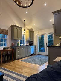 Cook with ease in the fully equipped kitchen featuring custom sage green cabinets, stainless steel appliances, a gas stove, microwave, dishwasher, coffee maker, and even a lobster pot for your authentic Cape Cod feast.