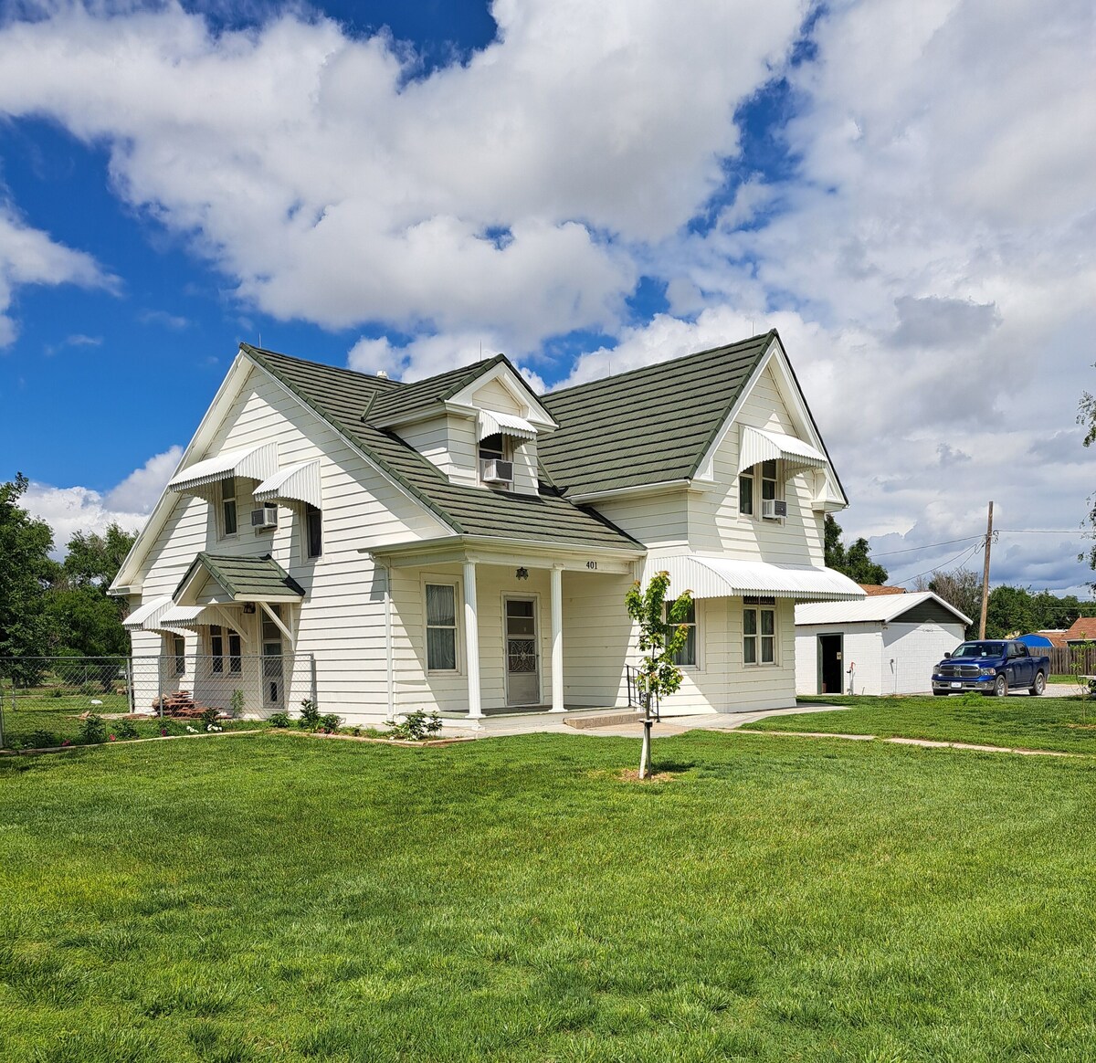 Welcome to the Peacock House! — a charming and completely restored two-story Victorian Folk homestead built in 1906, located just 16 miles west of Dodge City off Highway 50. This 4-bedroom home features a king bed, two queen beds, and a daybed with a trundle — all equipped with premium Nectar mattresses for exceptional comfort, including the trundle. Enjoy luxurious living spaces, a gourmet kitchen, high-tech amenities, WiFi, central heating and air conditioning, additional window units, oil heaters, a full-service laundry room, premium parking, and friendly neighbors. It's the perfect home base for your journey into the heart of the Old West.