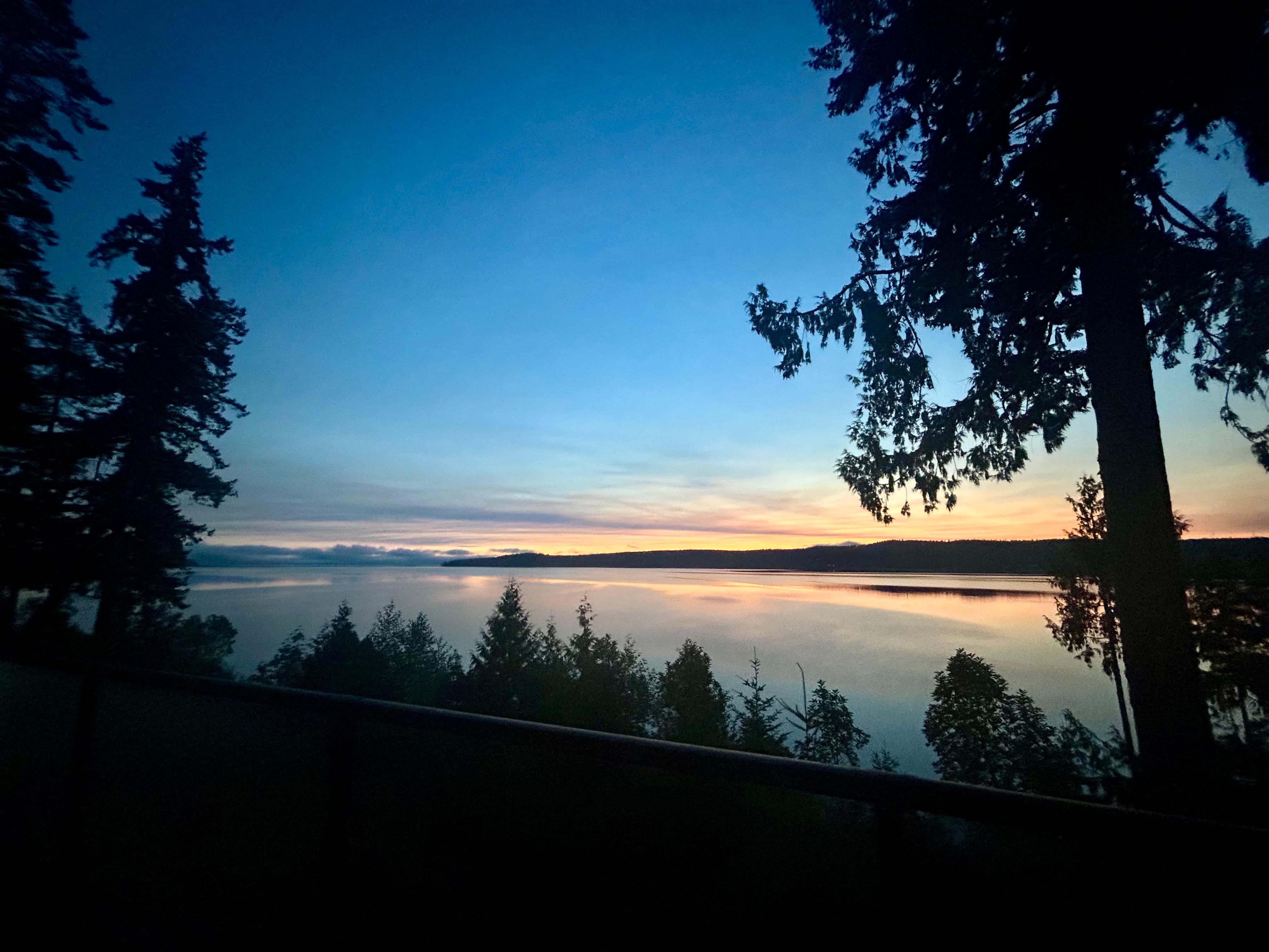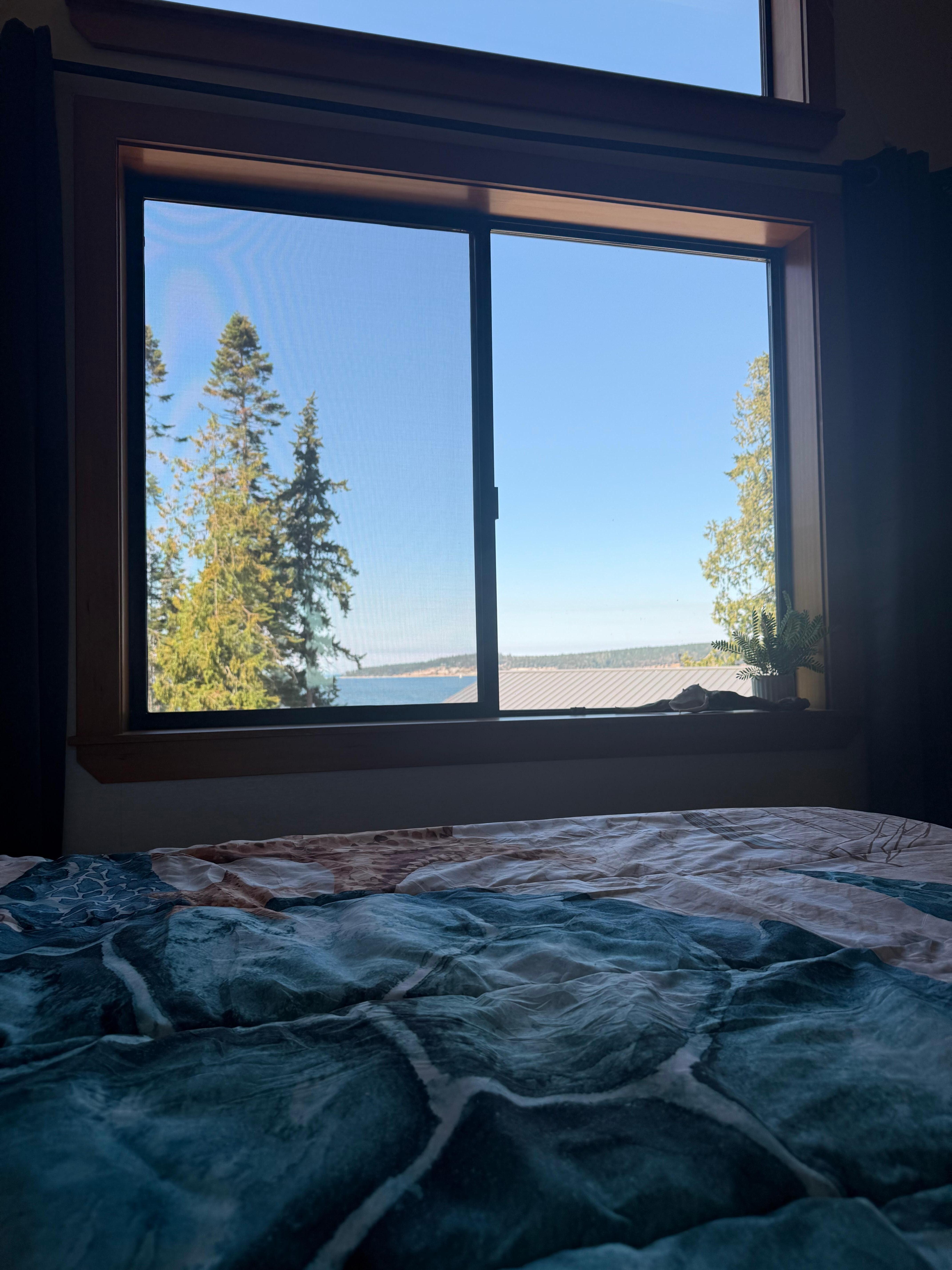 This enchanting one-bedroom home invites you to slow down, breathe deep and connect with nature while enjoying breathtaking views of Sequim Bay. Nestled in a secluded private complex, this tranquil haven is surrounded by towering pine trees and natural landscapes. Inside this cozy home built over a detached garage, you’ll find a comfortable living area, a well-equipped kitchen, and a peaceful bedroom with king size bed and a very comfortable sofa bed with air mattress. The large windows and a private balcony provide a stunning vantage point to observe the vast bay spread out before you. A staircase offers access to the private beach. Take a glass of wine and a snack, and enjoy the scenic view from the lookout at the halfway point to the beach. Our living room offers a comfortable sofa bed with air mattress, and the bathroom is stocked with all the essentials. Whether you're enjoying a cup of coffee while watching the picturesque sunrise, or spending a quiet evening viewing the stars, this gorgeous house has everything you need for a delightful stay. Experience what Sequim has to offer with a stay at our Sequim Bay Hideaway.