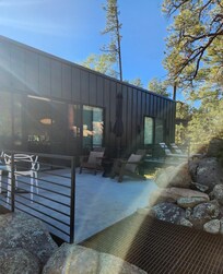 Kaliva Beta is a modern designer cabin just minutes from downtown Prescott. Designed by an award-winning designer, it features birch and lime plaster walls, luxe bedding, a full kitchen, and two private patios surrounded by pines and boulders. Perfect for romantic getaways, creative retreats, or remote work. Walk to the rodeo. Minutes to shops, restaurants, and trails—then return to your peaceful hideaway. Thoughtfully stocked with upscale amenities.