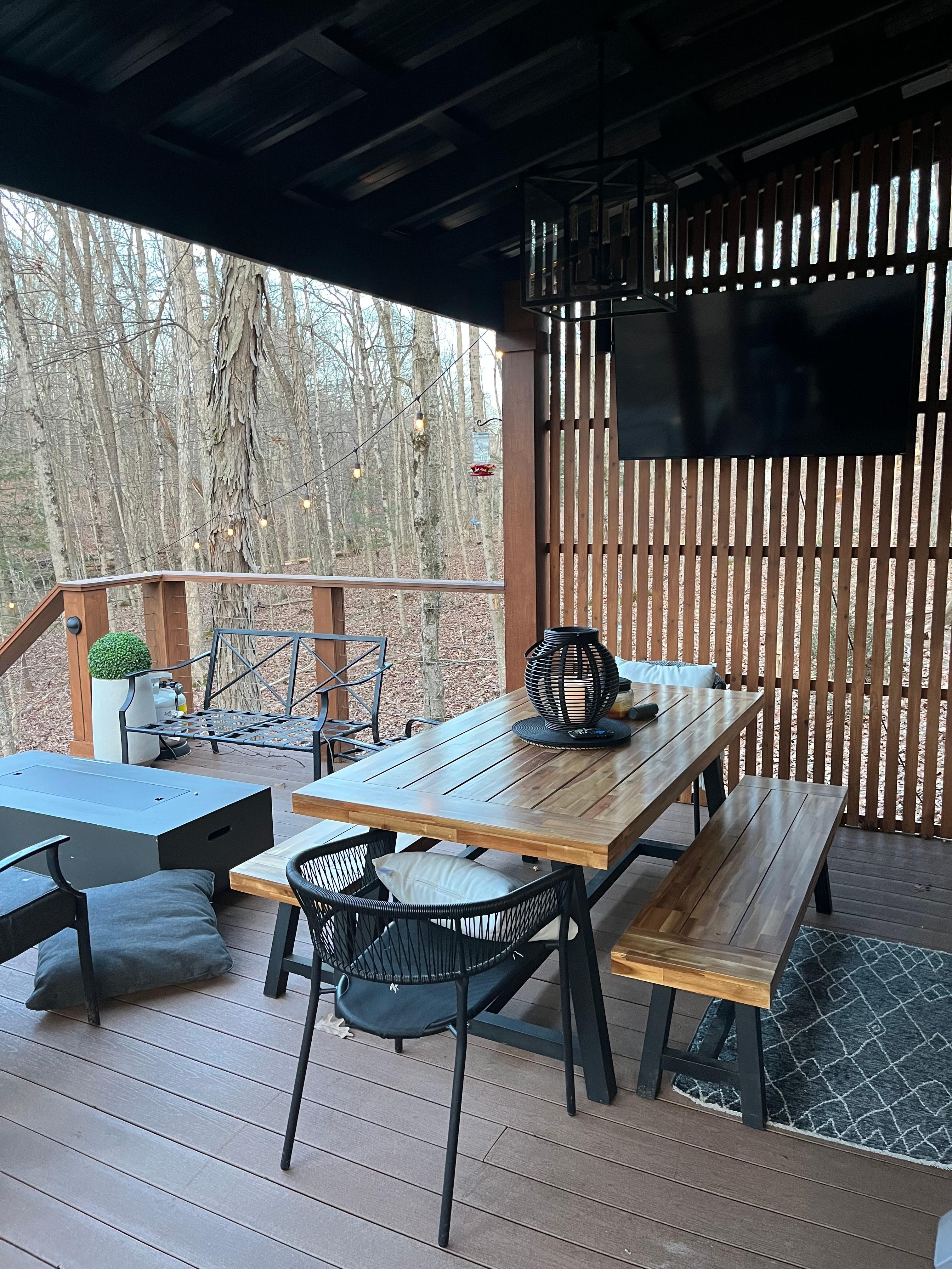 Outdoor Movie Nights – Watch your favorite films on the covered deck TV while relaxing by the fire table or soaking in the hot tub. Big game days hit different when you’re cheering on your team under the stars with friends and a cozy drink in hand.