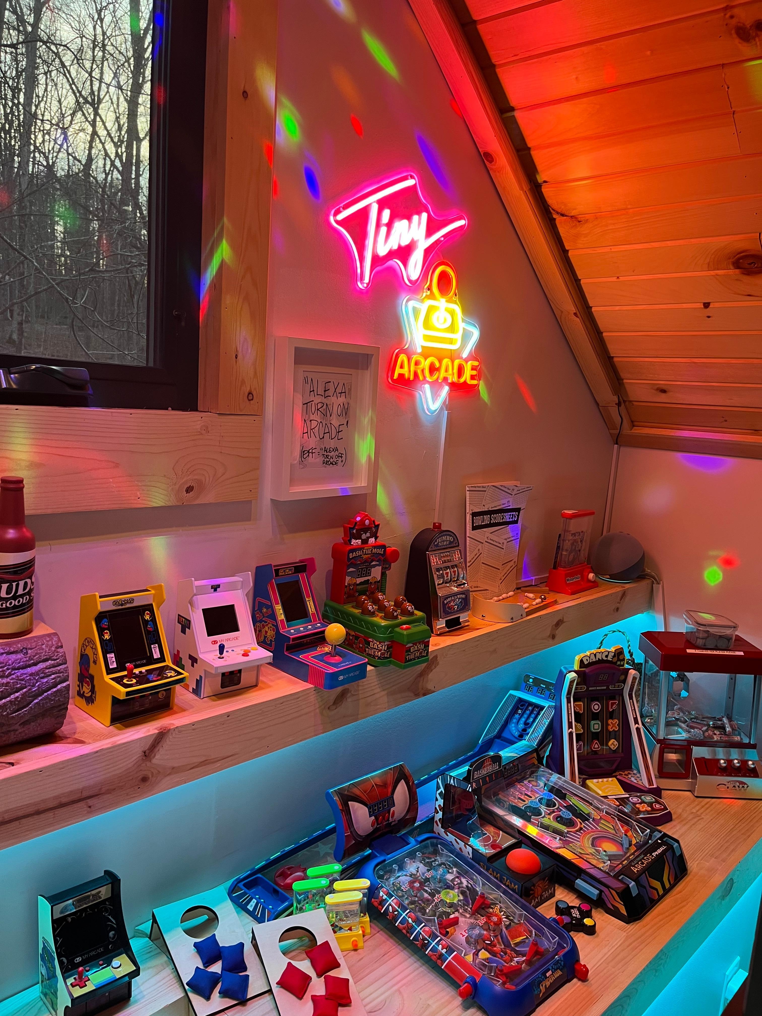 Play Like a Kid Again – Step into our tiny arcade (think a mini Pins Mechanical tucked in the woods), challenge your crew with board games big and small (yes, even tiny Operation, Jenga, and Trivial Pursuit), fire up the outdoor bar & grill, swing in the hammocks, or play porch games among the trees.