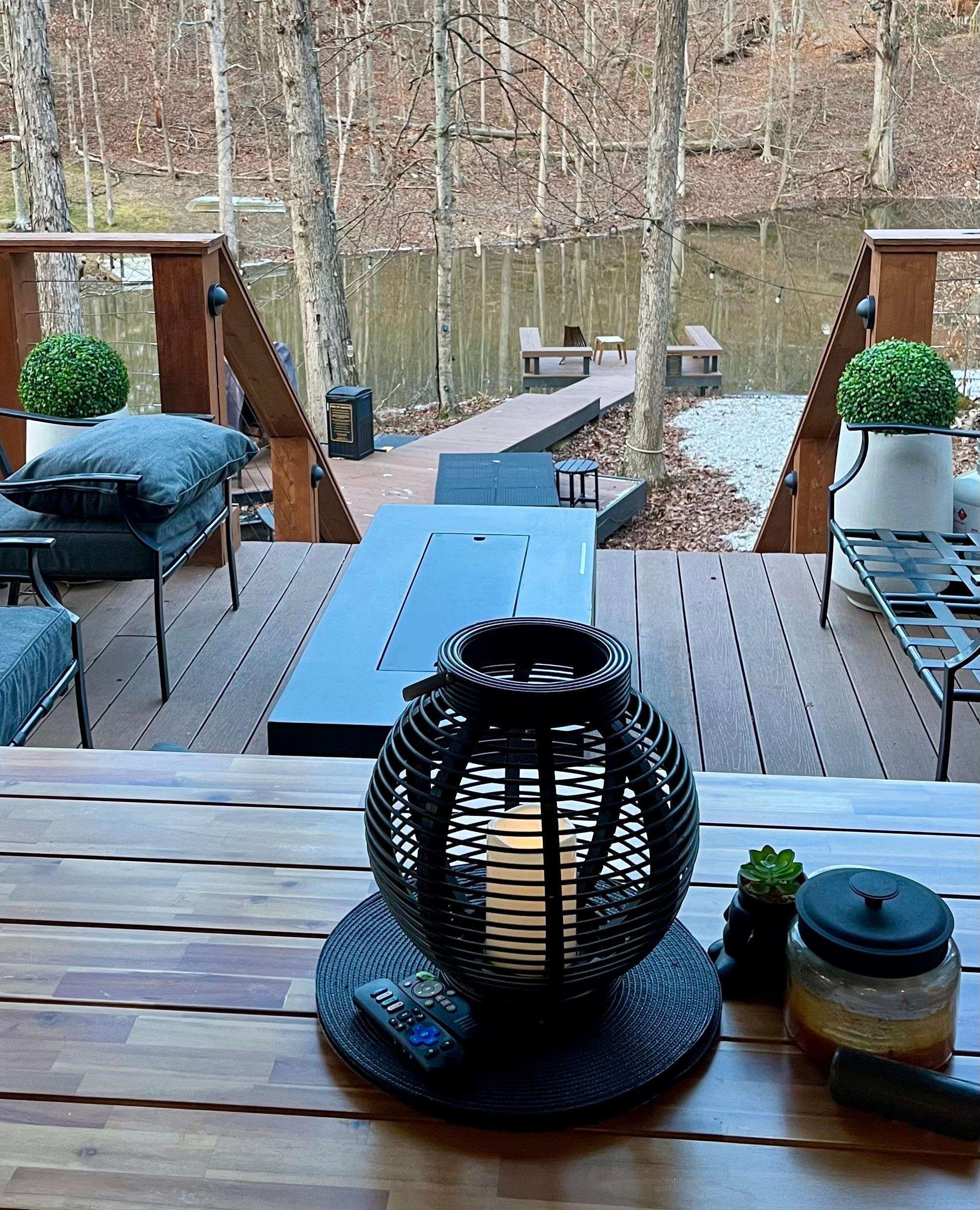 Cozy Comforts – Battery-operated candle-lit fireplace in the living room, smart TVs inside & outside, a stocked kitchen, coffee bar, complimentary slippers, staple toiletries, and surprise keepsakes to take home.