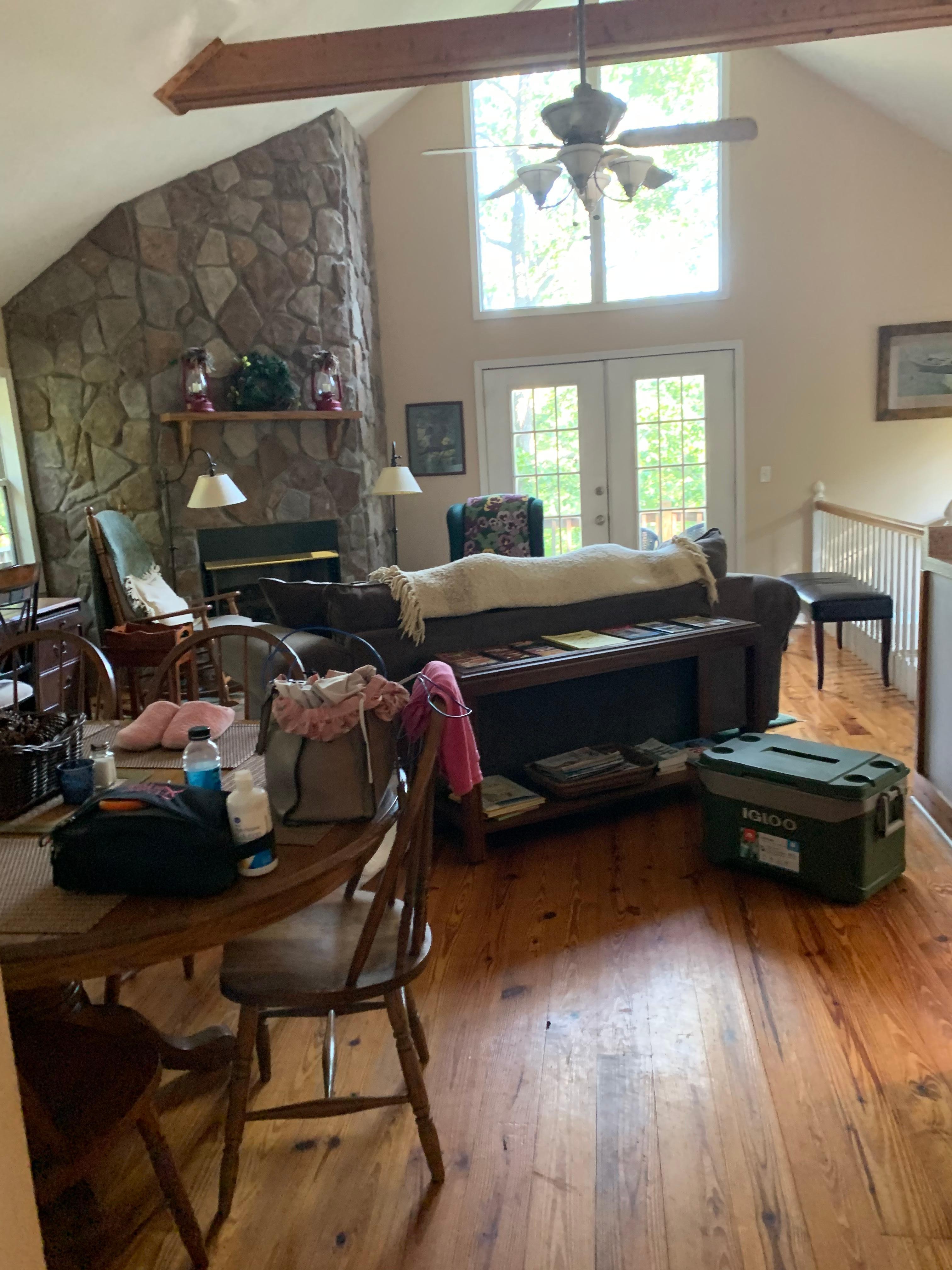 Our chalet has three levels, an open floor plan with a high ceiling on the main floor and lots of light. It is cozy and has a wonderful deck overlooking the forest. That gives us about the best view in the neighborhood as it looks out into nature. A huge stone fireplace in the lower level is original and available to guests in season and we provide the firewood. We know you will love the peace and quiet, the fresh air, and being close to nature.