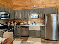 We have a fully stocked kitchen with everything you need in an open floorpan with the living room (and 55 inch TV) and dining area that can seat up to six. It is a very cozy cabin!