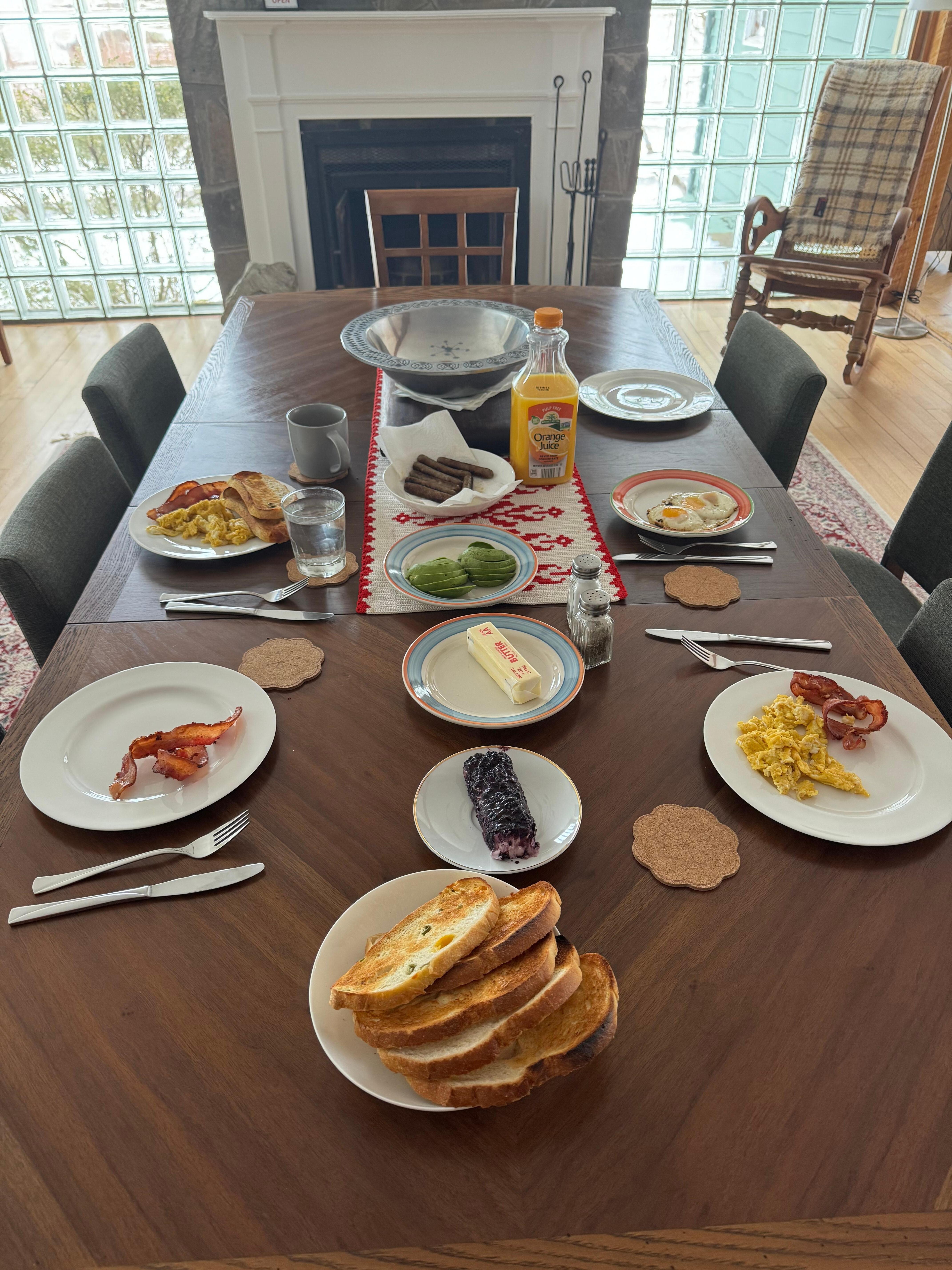 Gather for meals in this bright and welcoming dining space featuring a cozy fireplace and elegant glass-block windows. The large table invites up to eight guests, while rustic charm and natural light create the perfect setting for memorable dining experiences.