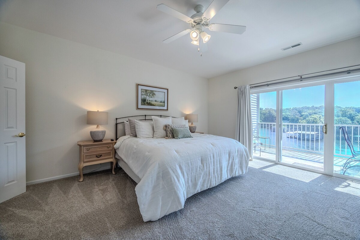 This immaculate unit features abundant natural light, an electric fire place, and the large outdoor deck provides enough space for everyone to eat out and enjoy the gorgeous lake views. The deck includes a BBQ grill and a ceiling fan to keep cool as well as space to relax and enjoy the lake views