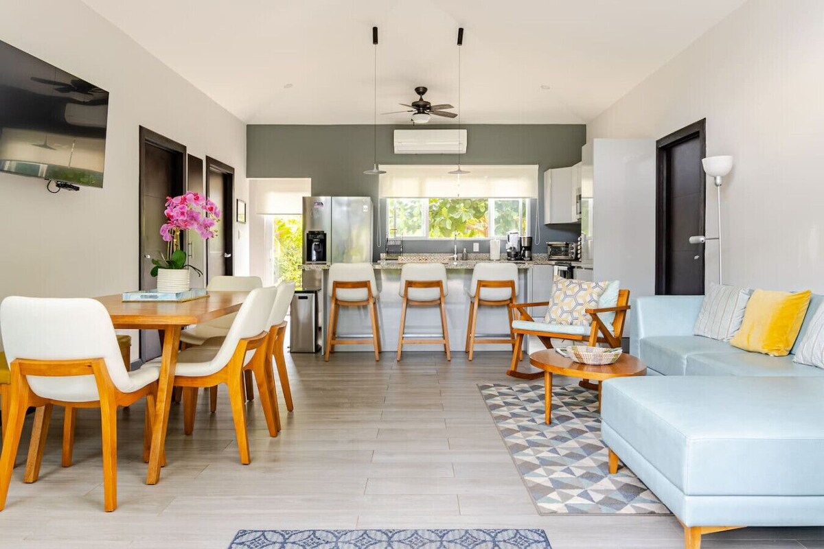 The master bedroom features a king-size bed, providing a luxurious retreat after a day in the sun, while the second bedroom is equipped with two twin beds. Both bedrooms come with their own en-suite bathrooms for added privacy and convenience. The living area is bright and spacious, with large windows that bring in natural light and offer views of the surrounding tropical landscape. The open-floor kitchen is fully equipped with everything you need for a home-cooked meal, ideal for relaxing evenings after a day of exploring.