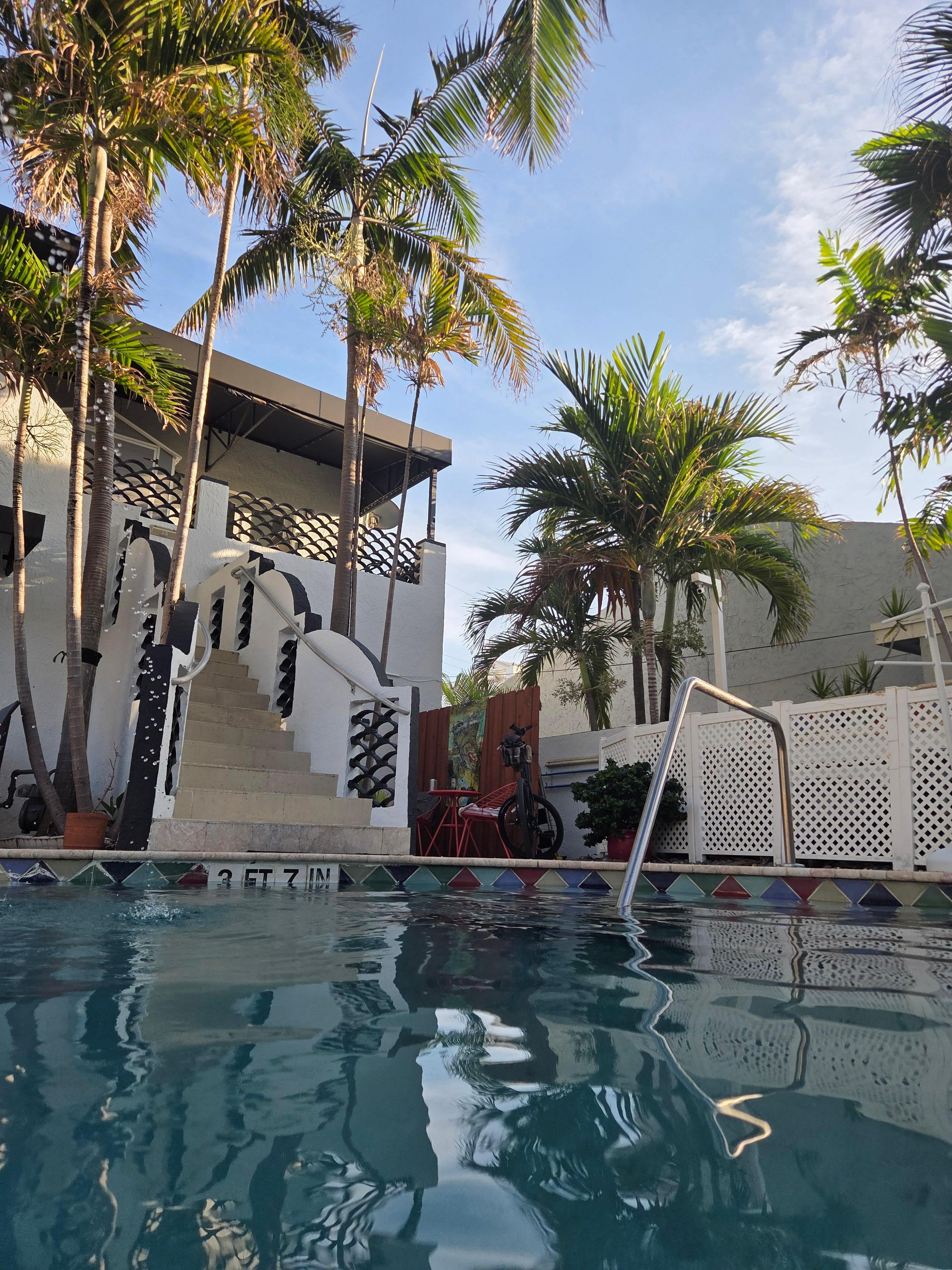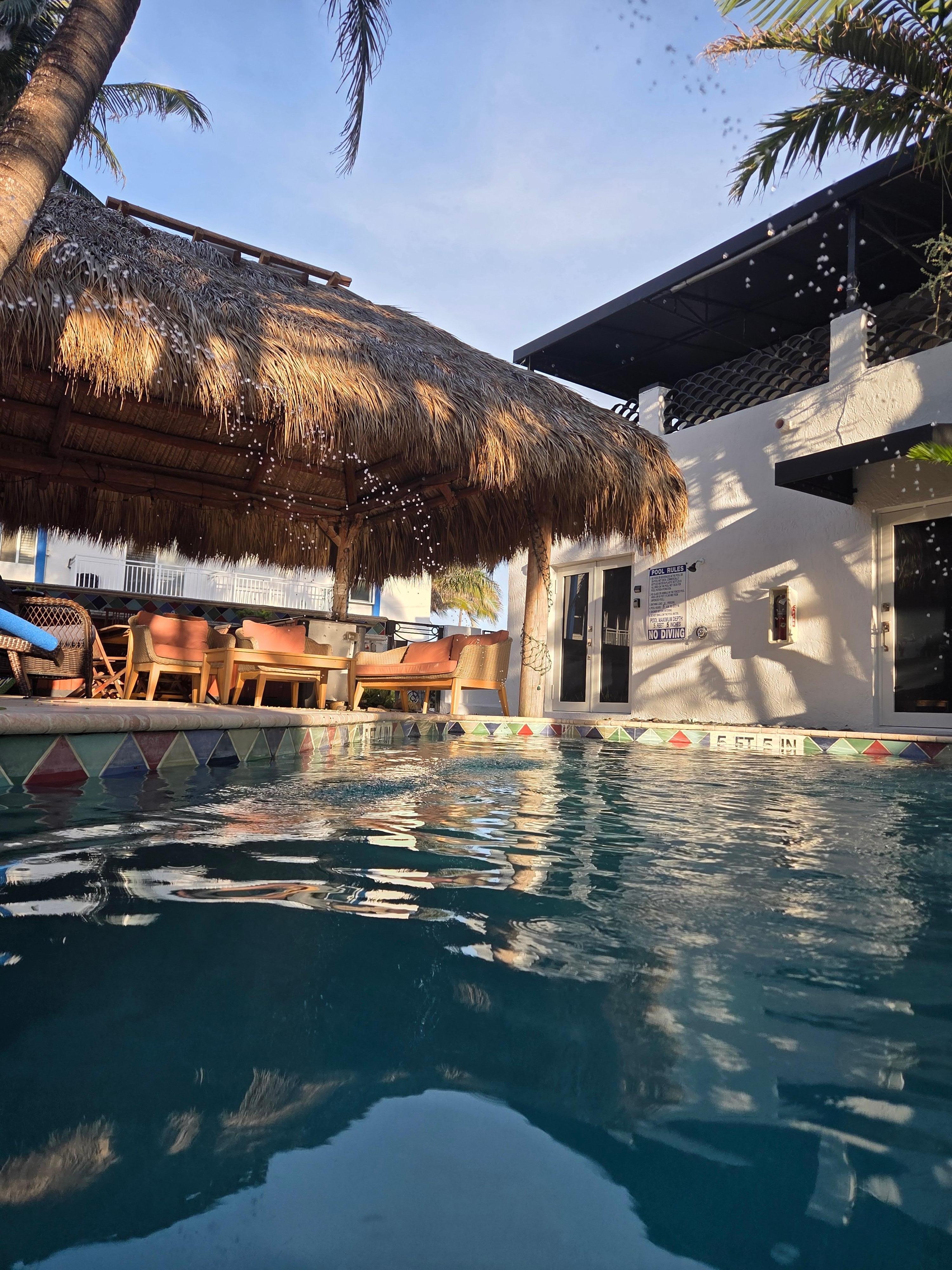Guests have full access to the shared courtyard with a pool, tiki hut, grill, outdoor shower, and on-site laundry.