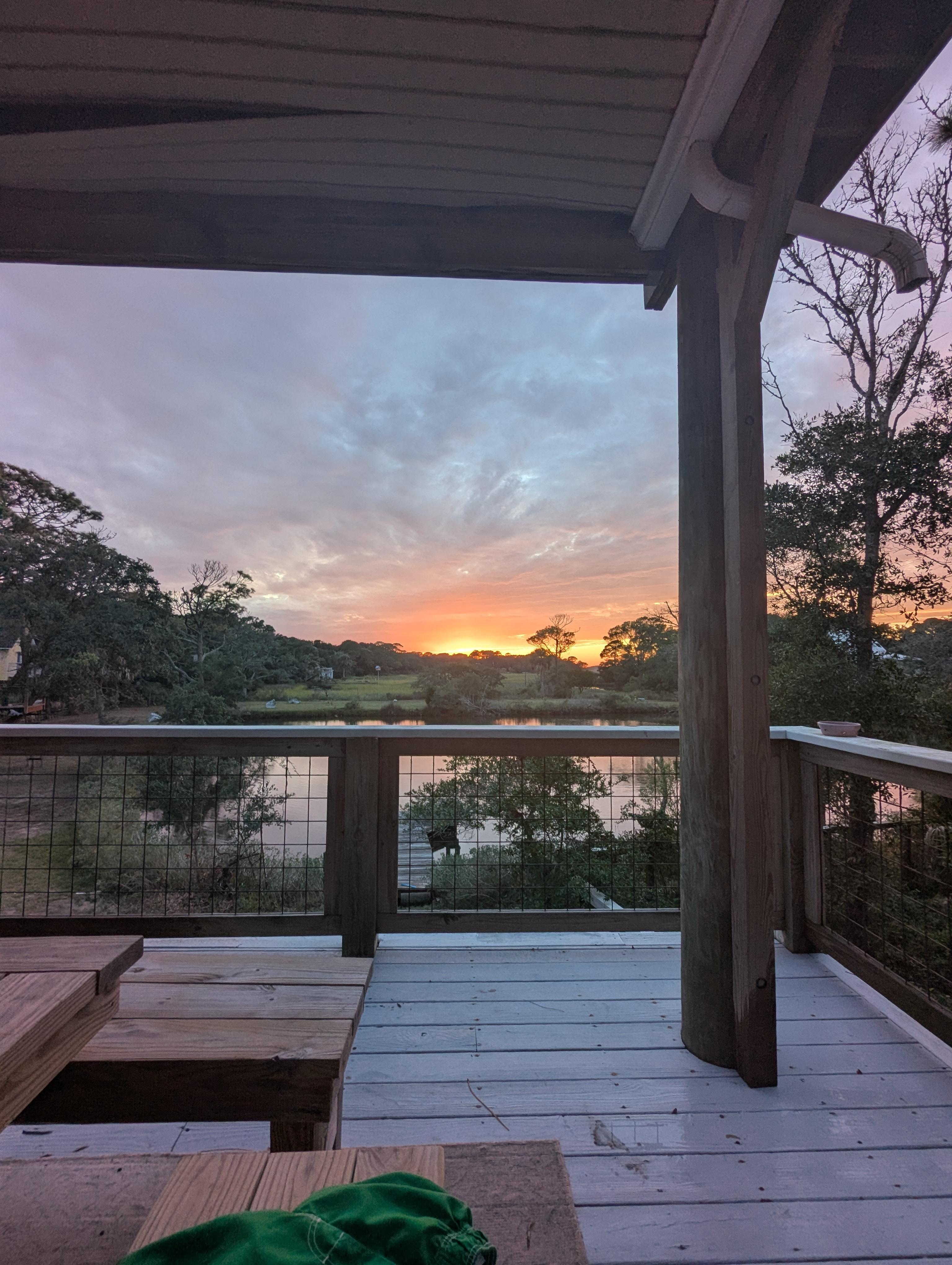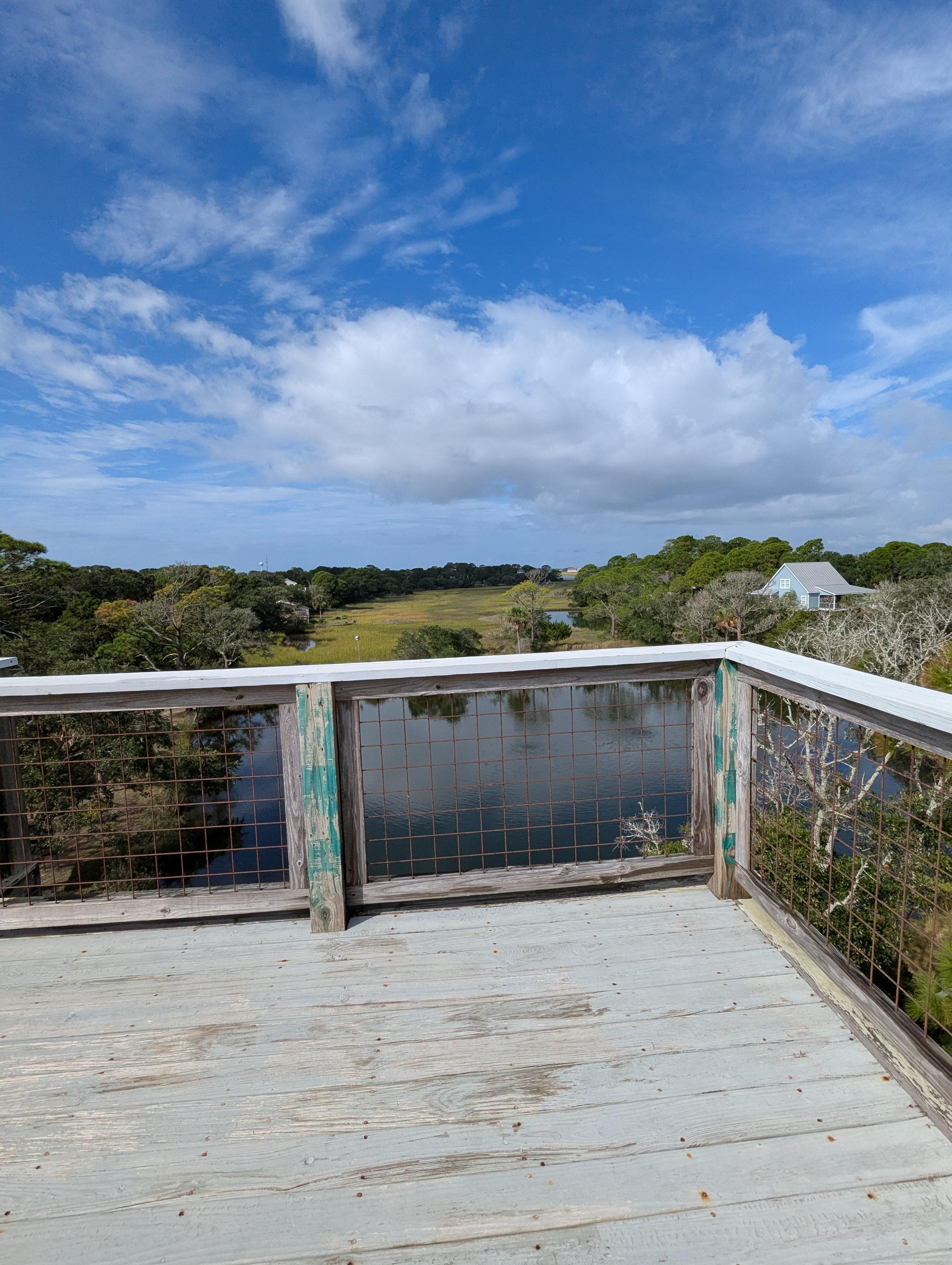 One of the most unique homes you can find on Folly Beach, this retreat sits on a private nature lot that boasts a private salt lake, dock, and over an acre of land! Don't worry about a long commute to the beach, as the beach access path is less than a block away for the surfers to get their fill of The Washout', a favorite local surfing spot. When you want to get a bit of fresh air and sunshine at home base, there is a large deck on the back of the home which also has a spiral staircase going up to a second deck landing. The deck right off of the living room and kitchen has a large custom-made picnic table that will seat all of your guests and overlooks the lake, making it a great spot for dining alfresco! The second-floor deck area has a love seat and chairs which usually has a nice breeze and is a great place for morning coffee or evening cocktails. Not to mention, there are two outdoor showers and a gas grill to rinse off sandy toes or host a cookout in the fresh air.
